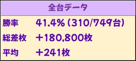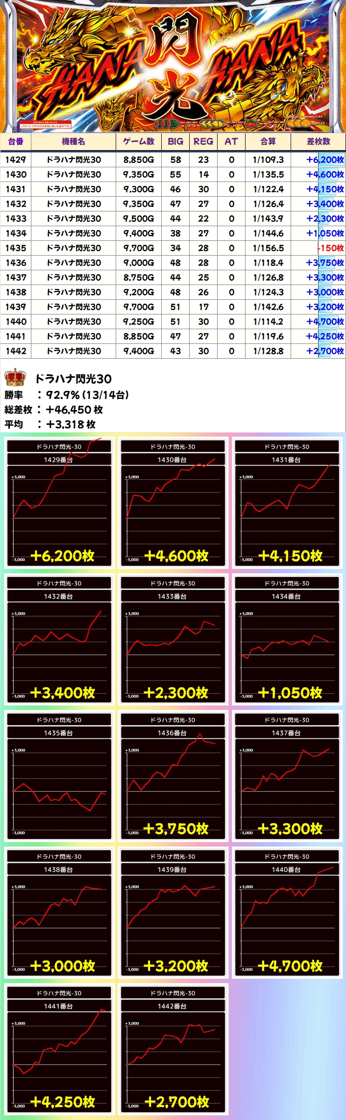 残りの機種も素晴らしい結果を残しており、ドラハナ閃光に関しては勝率92.9%(13/14台)かつ平均+3318枚と、極めて質の高い結果になっていました。