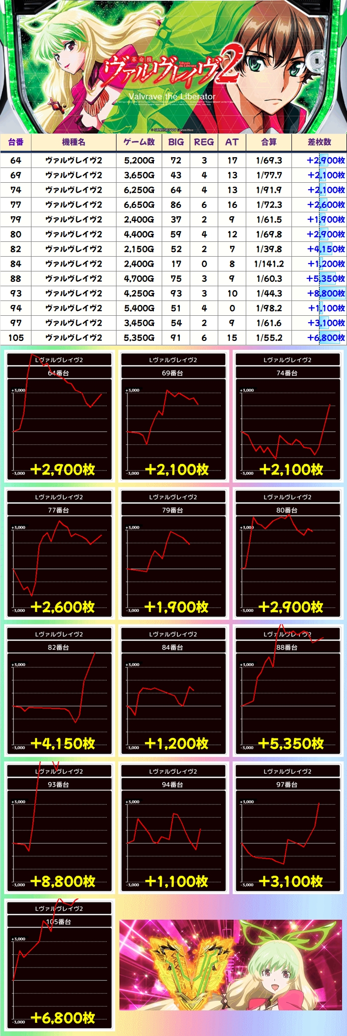 この日はヴァルヴレイヴ2から+8800枚を筆頭に大量出玉が多数出現! 機種全体では13台が+1000枚overを記録していました!