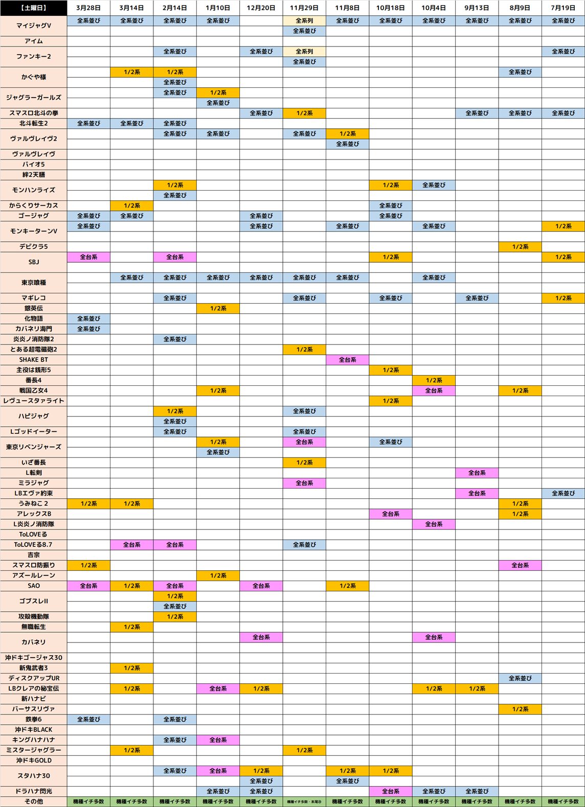 本日の高配分機種は上記の通り。土曜日ということで幅広いラインナップからの仕掛けとなったようです。