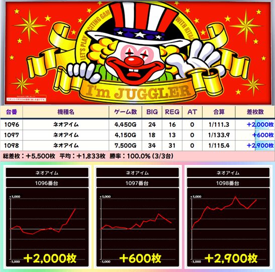 【3台並び】1096番台〜1098番台 ネオアイムジャグラーEX▶平均+1,833枚