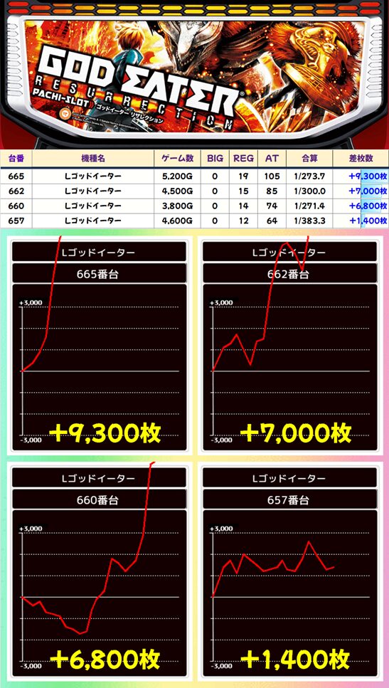 8の日ということでヤマサ機種が注目の1日。ゴッドイーターからは9000枚超・7000枚超の爆裂台を確認!