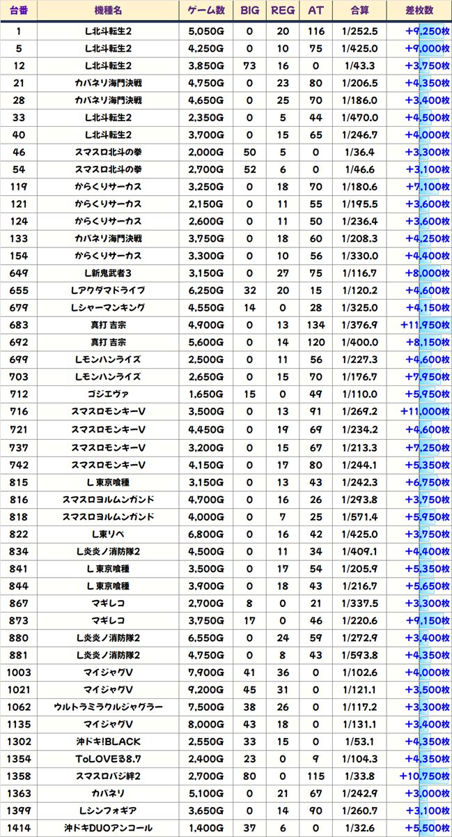 優秀台(+1000枚超)をピックアップしていきますので確認していきましょう!