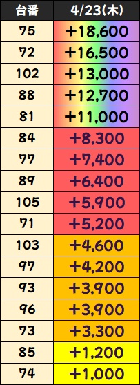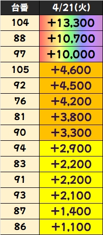 過去の傾向として27日までは対象フロアでのお宝台の大量投入に期待できますので、明日以降は積極的に4Fフロアを狙ってみるのも一つの手段と言えますね。