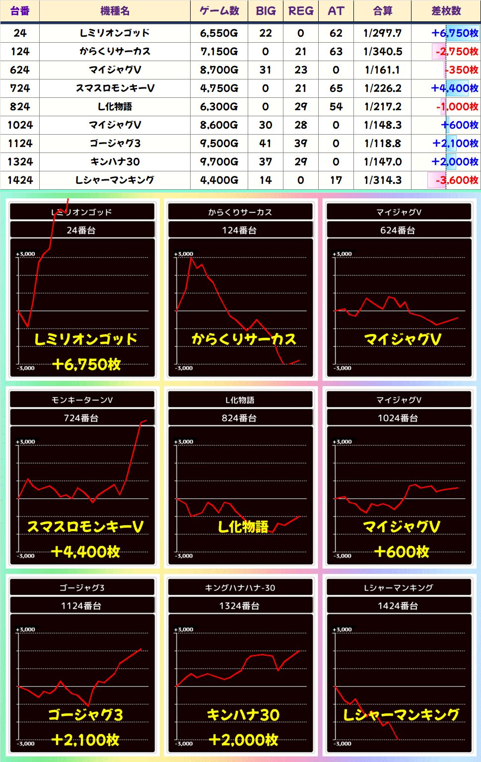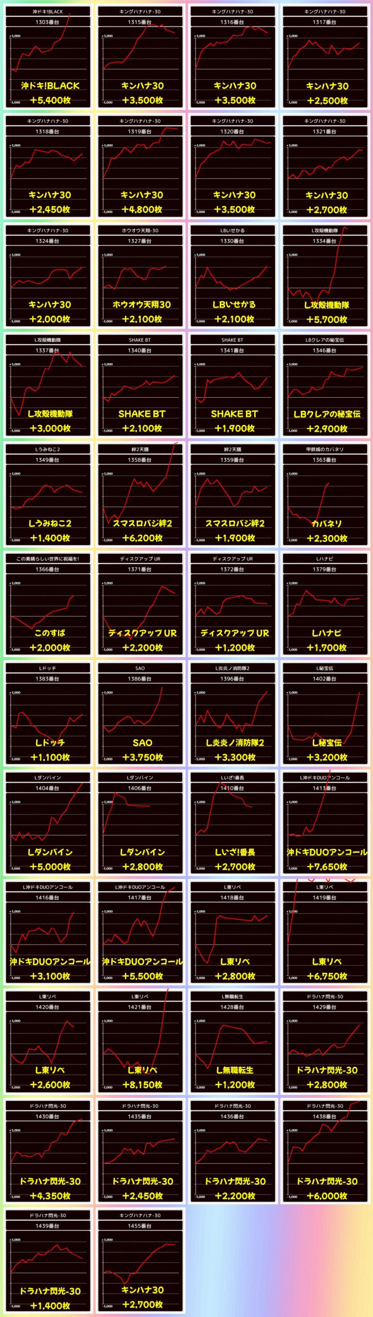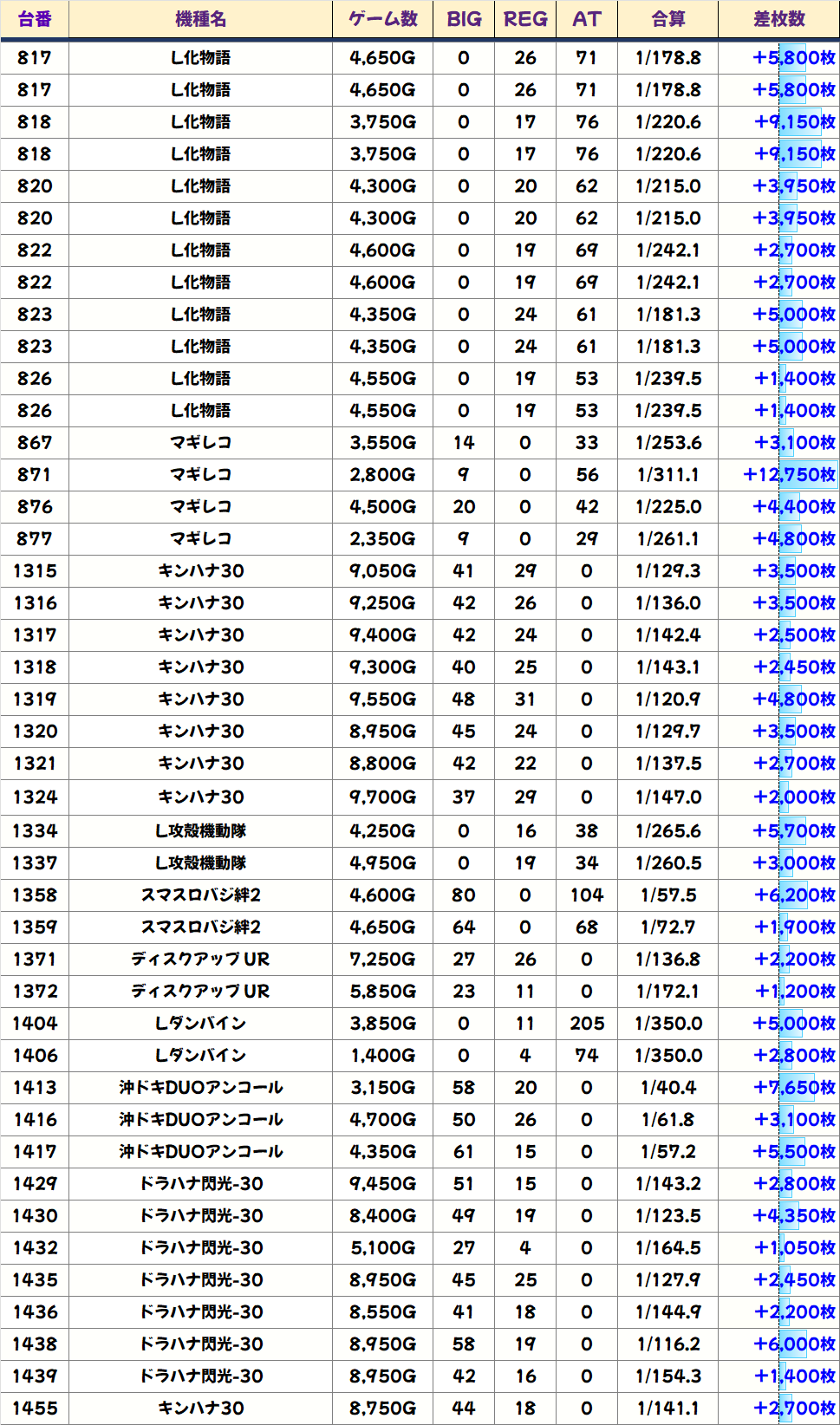 本日は1/2系濃厚の仕掛けや並び・列仕掛けの機種を中心に、その他機種からもお宝台が多数登場する結果に。平均では+3300枚を超えてきました!