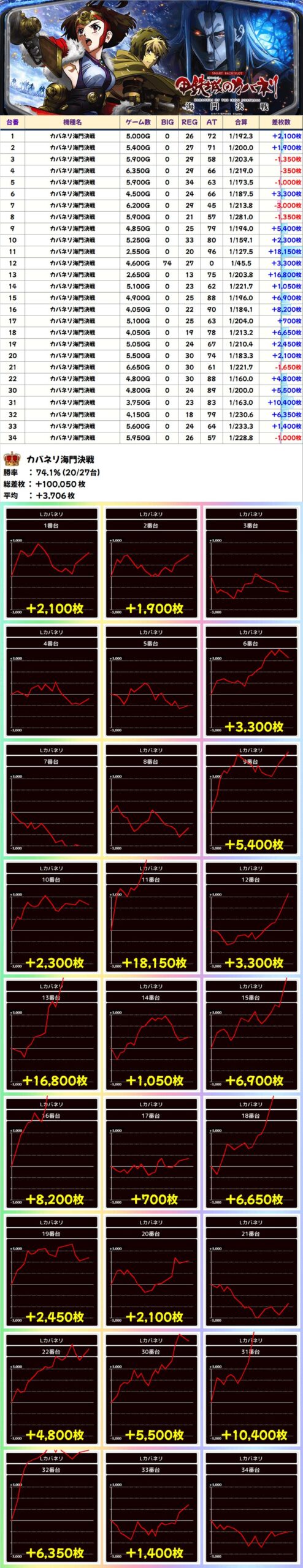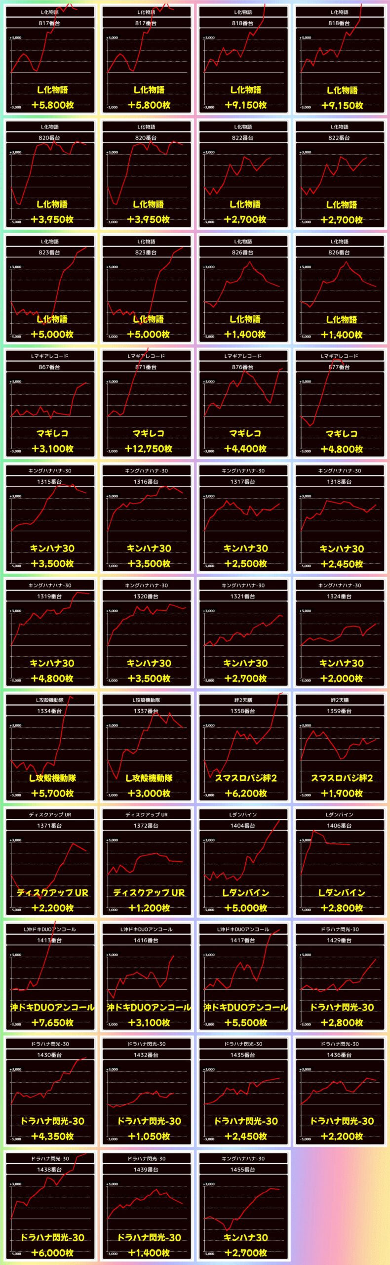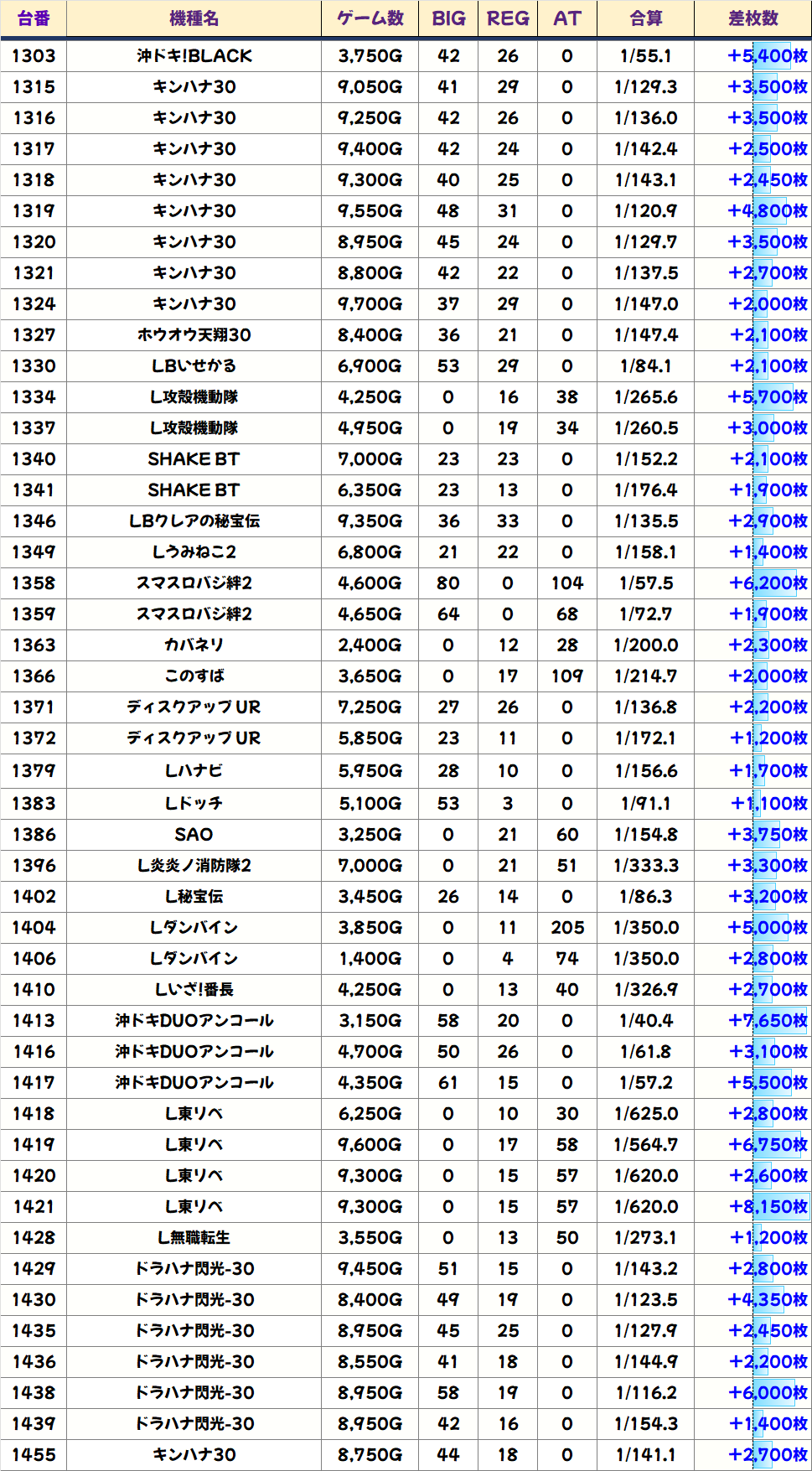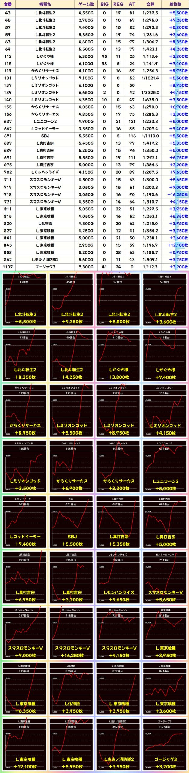 本日は1/2系濃厚の仕掛けや並び・列仕掛けの機種を中心に、その他機種からもお宝台が多数登場する結果に。平均では+3300枚を超えてきました!