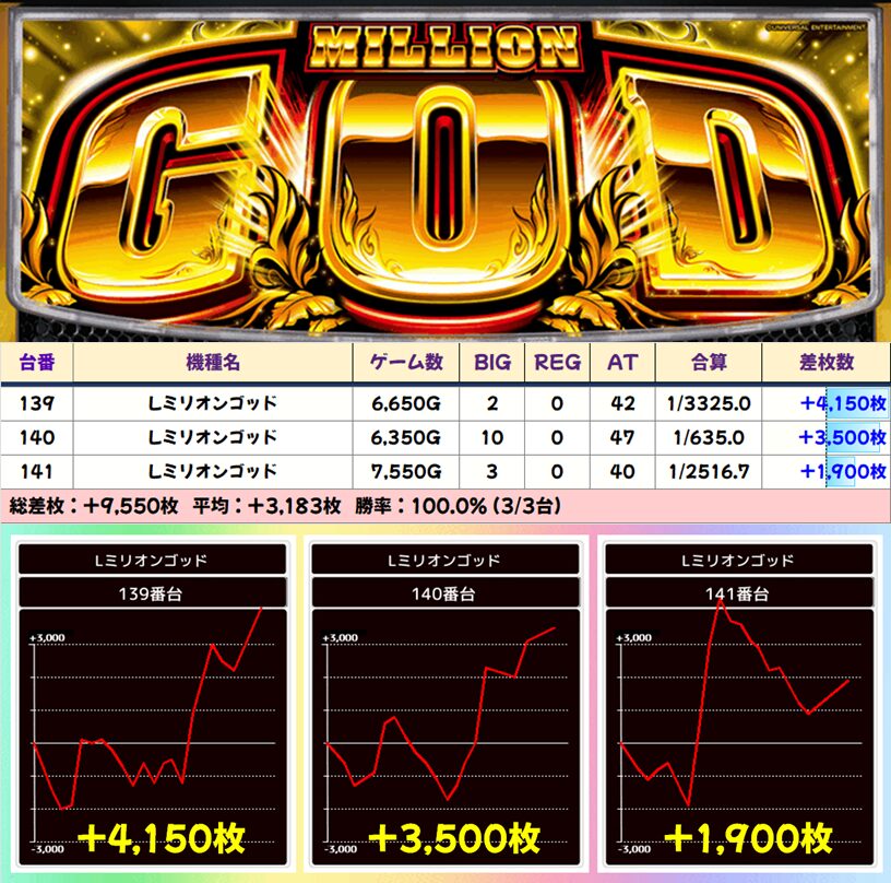 【3台並び】139番台〜141番台 ミリオンゴッド神々の軌跡▶平均+3,183枚