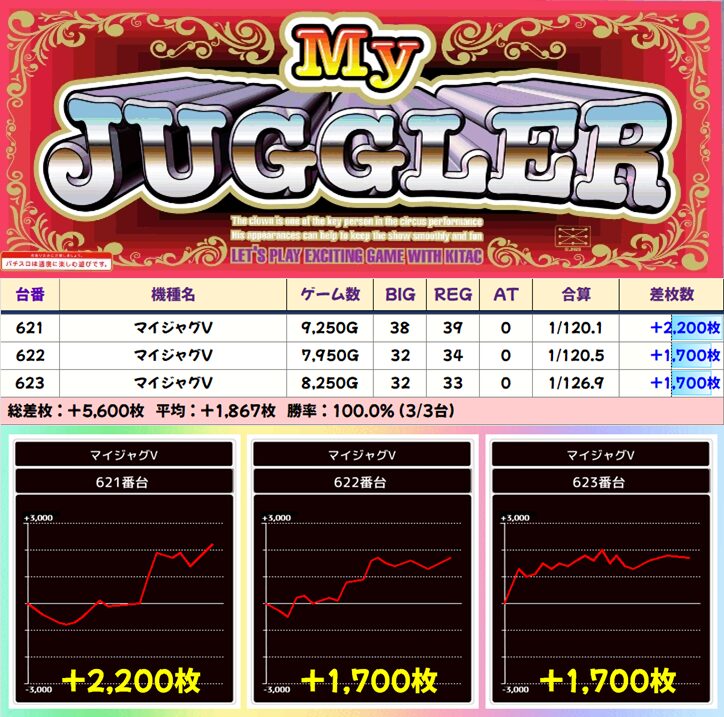 【3台並び】621番台〜623番台 マイジャグラーV▶平均+1,867枚