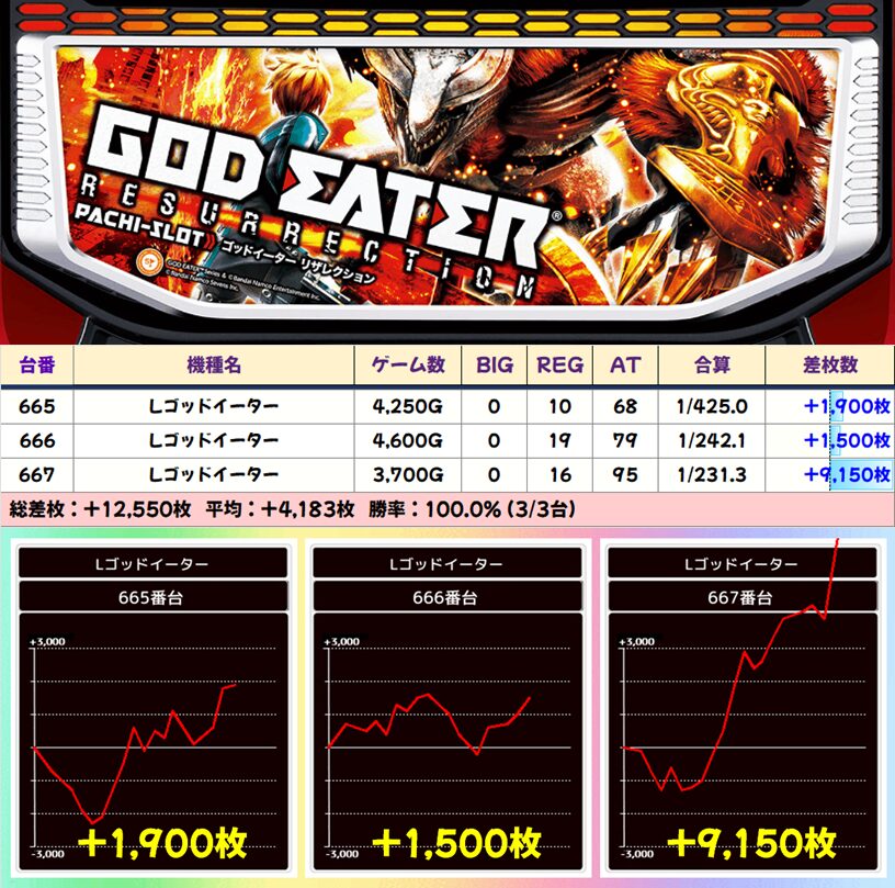 【3台並び】665番台〜667番台 ゴッドイーター▶平均+4,183枚