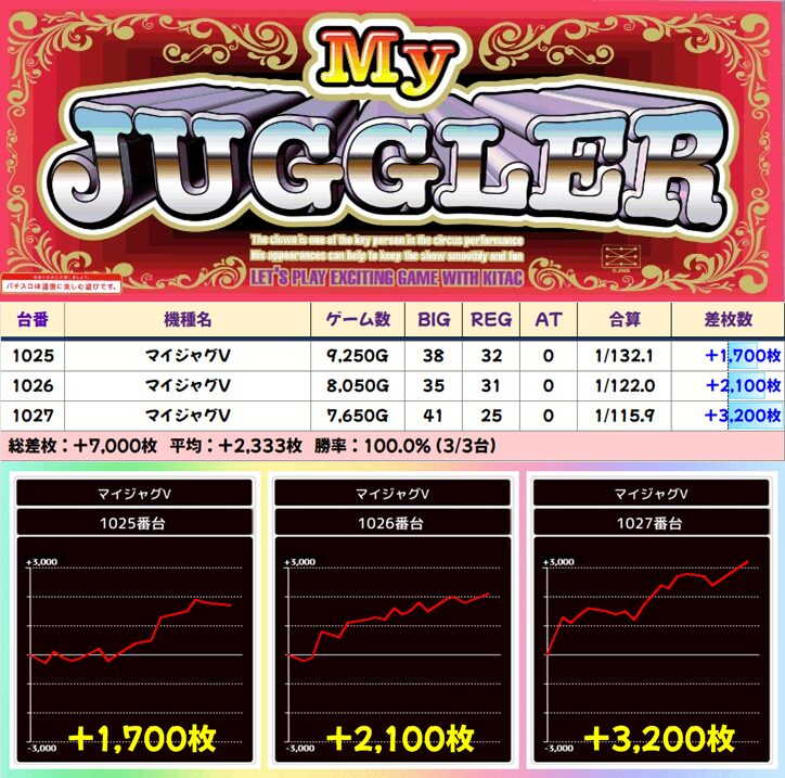 【3台並び】1025番台〜1027番台 マイジャグラーV▶平均+2,333枚