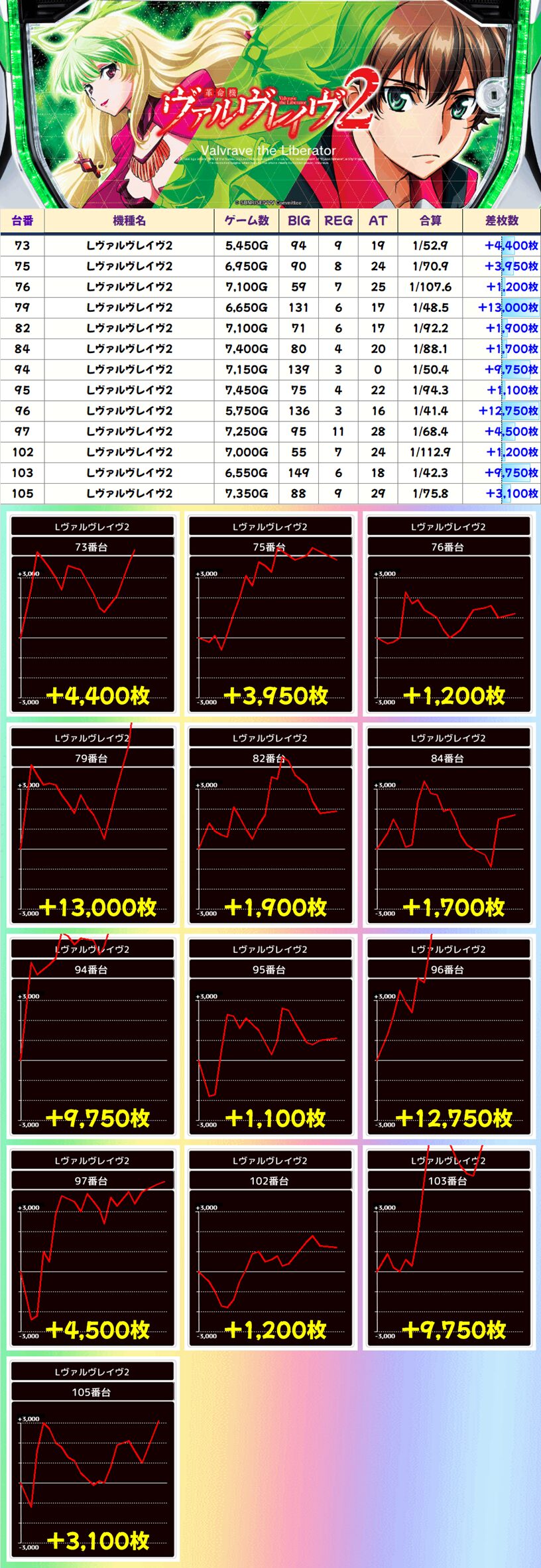 前日全台系濃厚だったヴヴヴ2。その勢いは衰えず本日も万枚超が2台!9000枚超も2台と大量獲得台が目立つ結果に!!