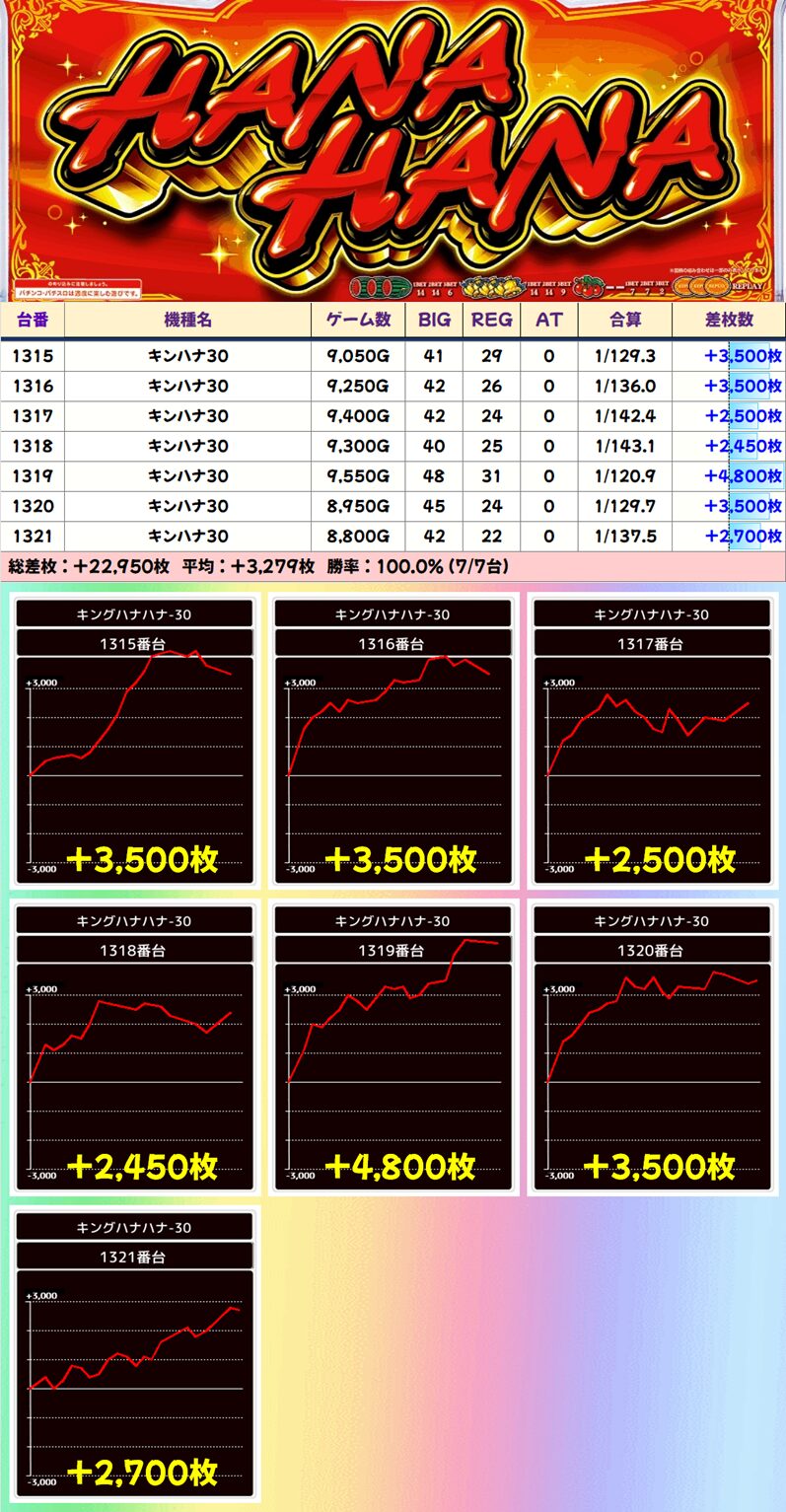 【列仕掛け】1315番台〜1321番台 キングハナハナ▶平均+3,279枚