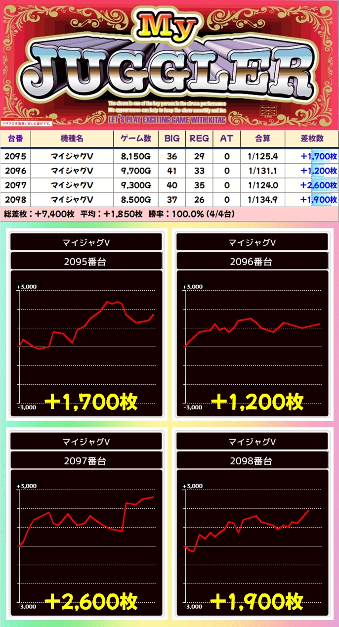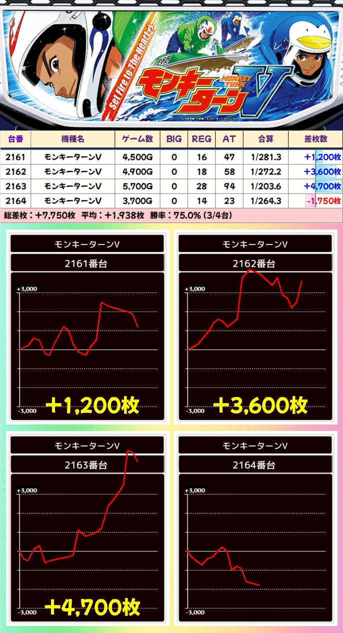 この日も例に漏れず並び仕掛けが複数用意されていたようで、毎日オススメ機種の「マイジャグ」と「モンキーターンV」などから4台並びを確認!