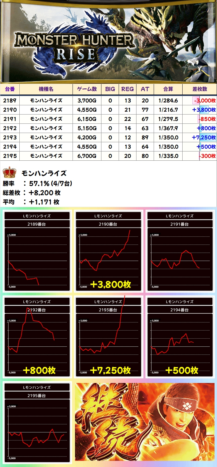 【1/2系濃厚】モンハンライズ(4/7台+)→平均+1,171枚