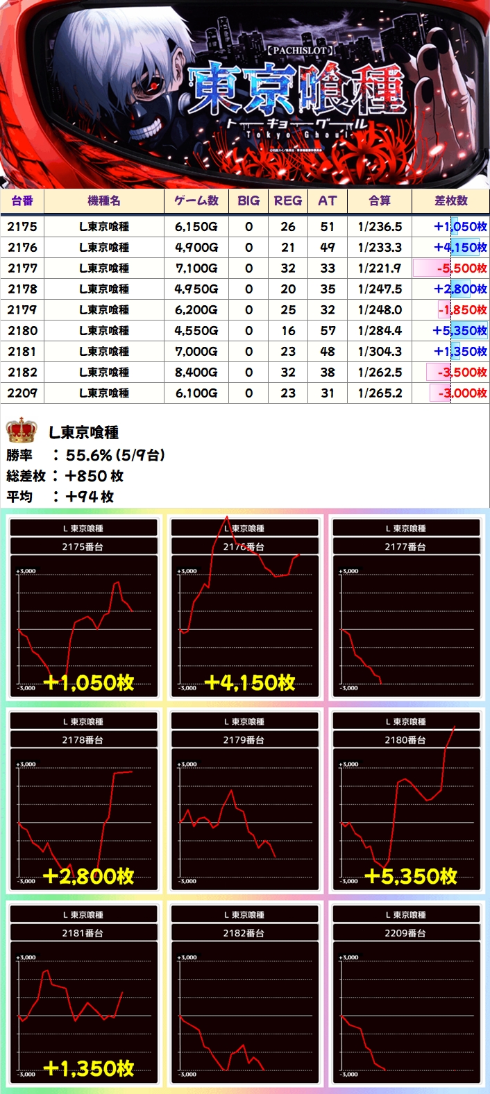 この日は高配分機種も複数用意されていたようで、9月8日~9月14日のオススメ機種となっている「モンハンライズ」や毎日オススメの「東京喰種」など複数の機種が1/2系濃厚の結果に!