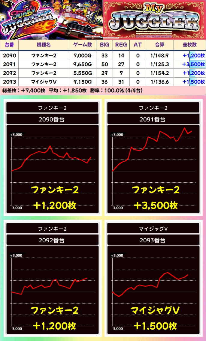 上記の機種からは+5000枚以上のド派手な出玉も確認でき、「ゴージャグ」からも合算1/91.6で5000枚クラスの台が出現していましたよ!