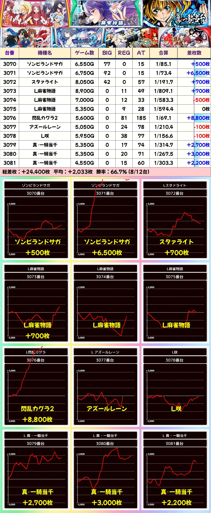 この列仕掛けには7機種が含まれており、「ゾンビランドサガ」から+6500枚、「閃乱カグラ2」から+8800枚とド派手な出玉も出現していました。