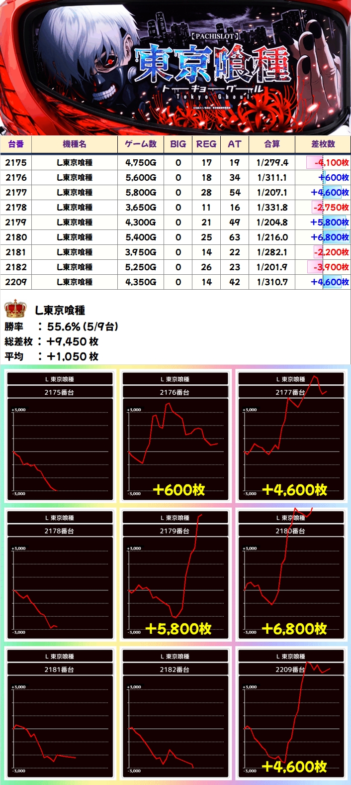 【1/2系濃厚】L東京喰種(5/9台+)→平均+1,050枚