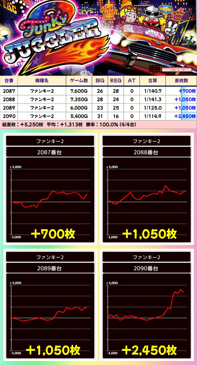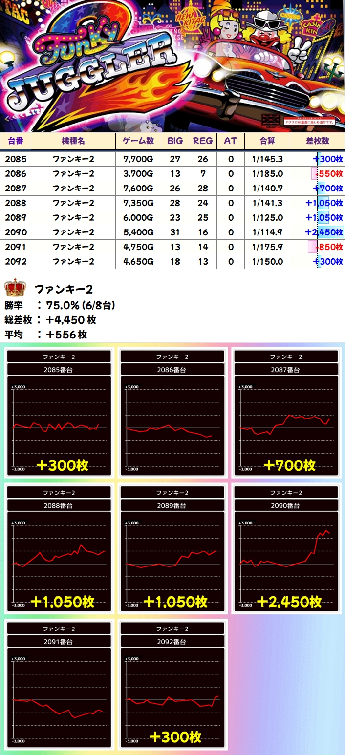 【1/2系濃厚】ファンキー2(6/8台+)→平均+556枚