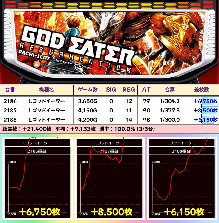 上記の機種からはド派手な出玉も出現しており、「銭形5」と「モンキーターンV」からは万枚オーバー台が出現。特に「モンキーターン」は+18250枚、+16350枚とコンプリート級の出玉が飛び出しており、圧倒的な出玉を見せつけていました。
