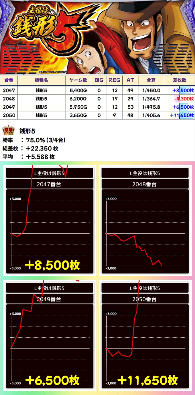 【全台系濃厚】主役は銭形5(3/4台+)→平均+5,588枚
