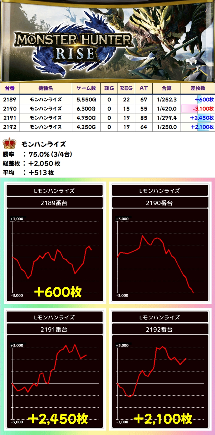 【1/2系濃厚】モンハンライズ(3/4台+)→平均+513枚