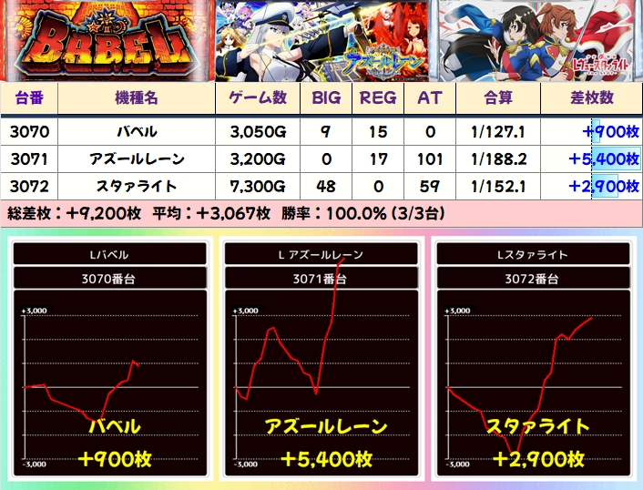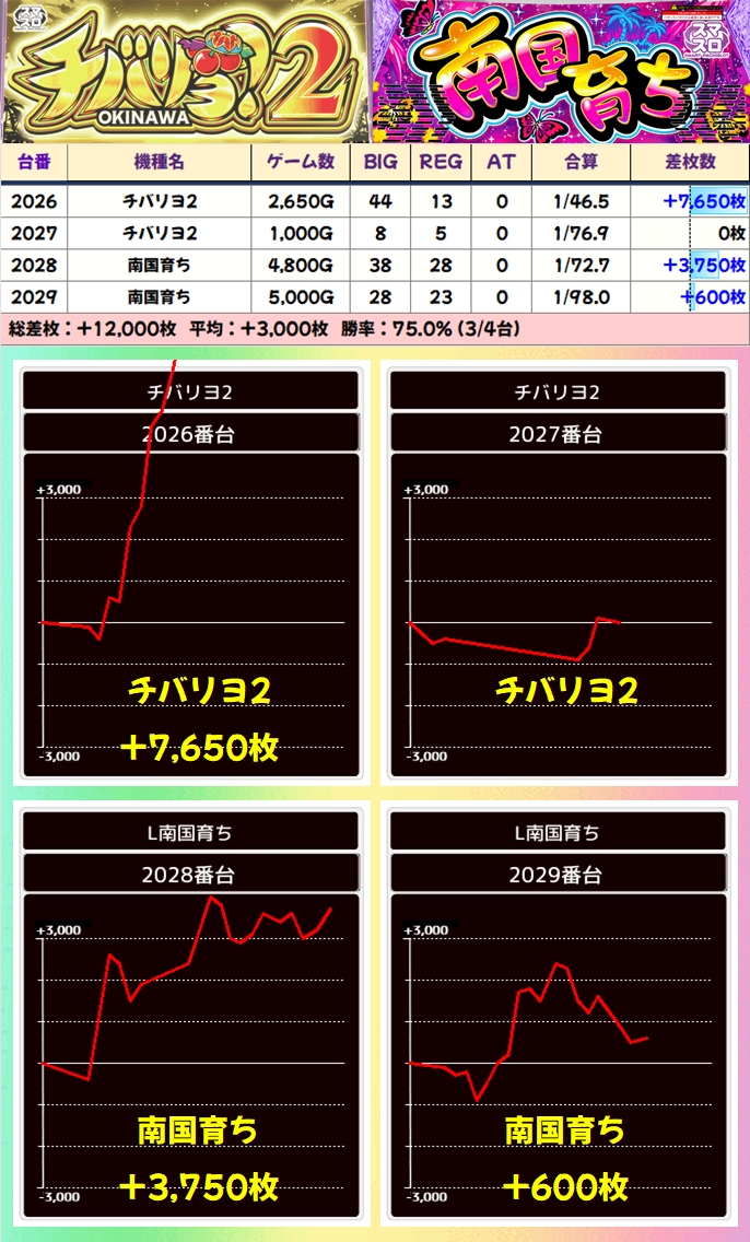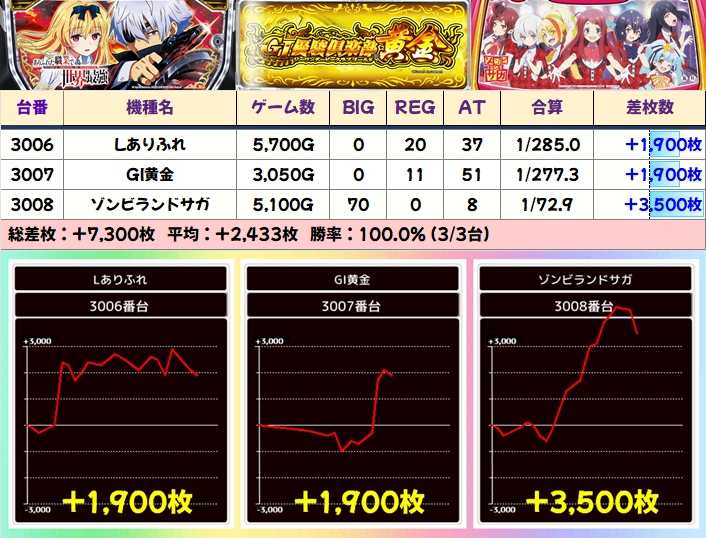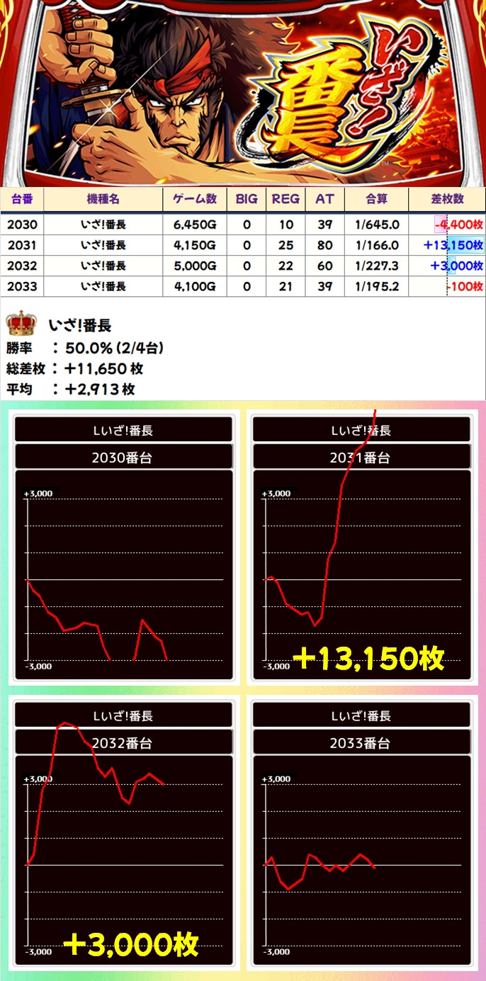 また、いざ!番長からも+13000枚超の万枚突破台が出現しており、この日は万枚オーバー台が続出していました。