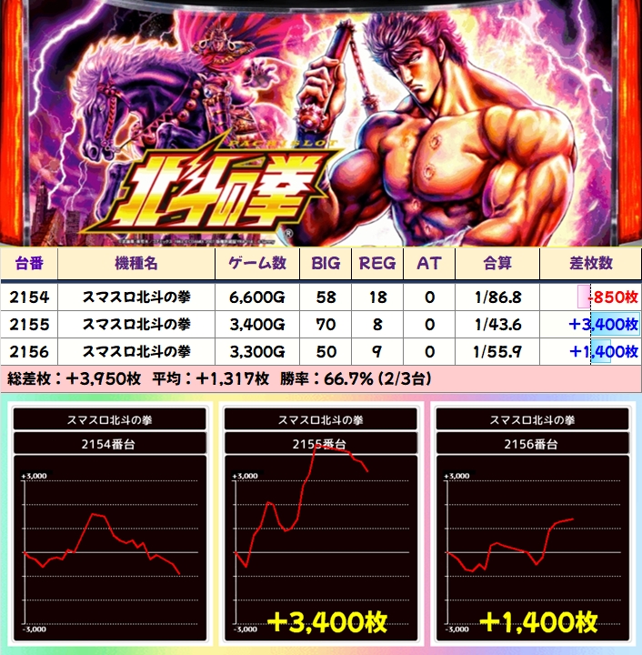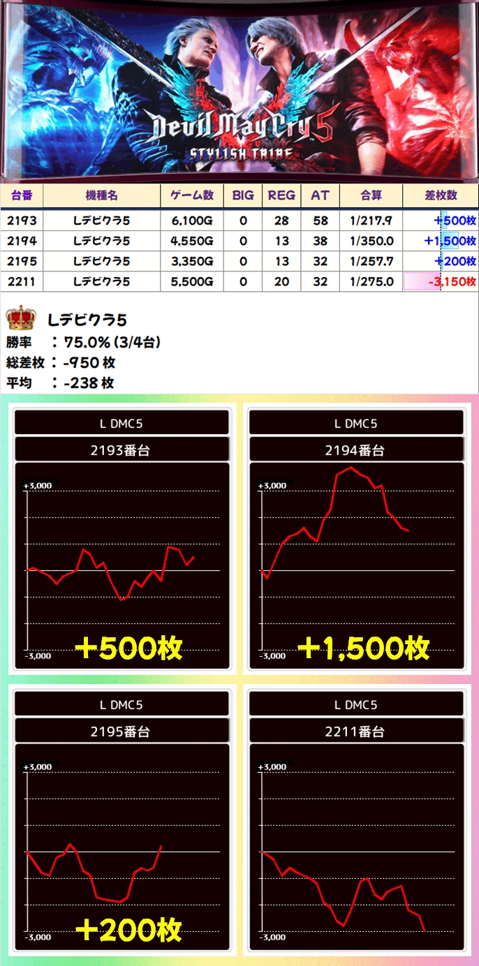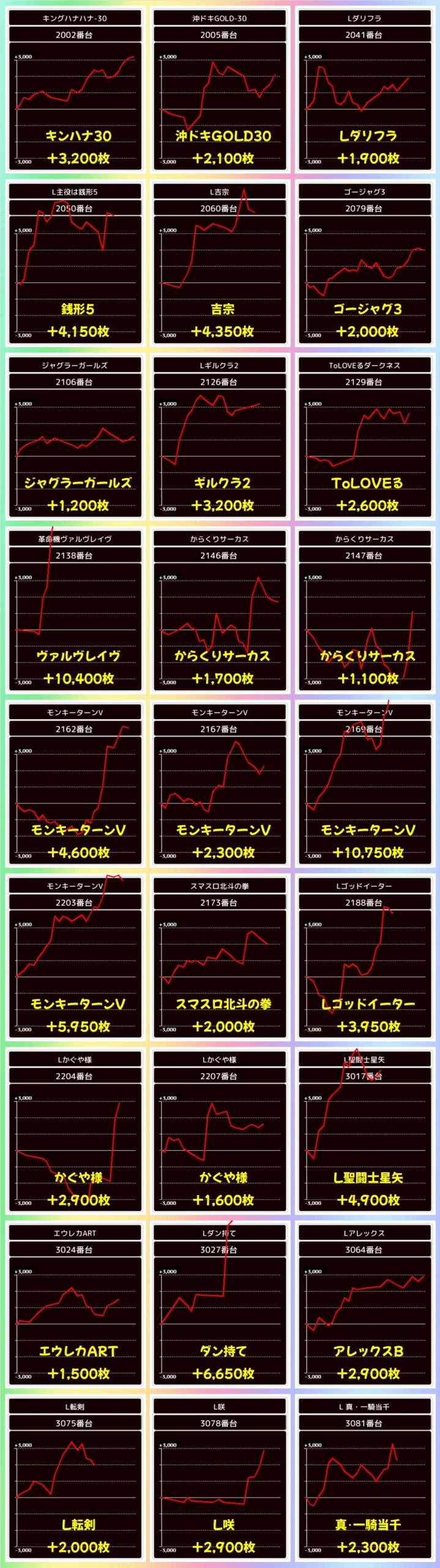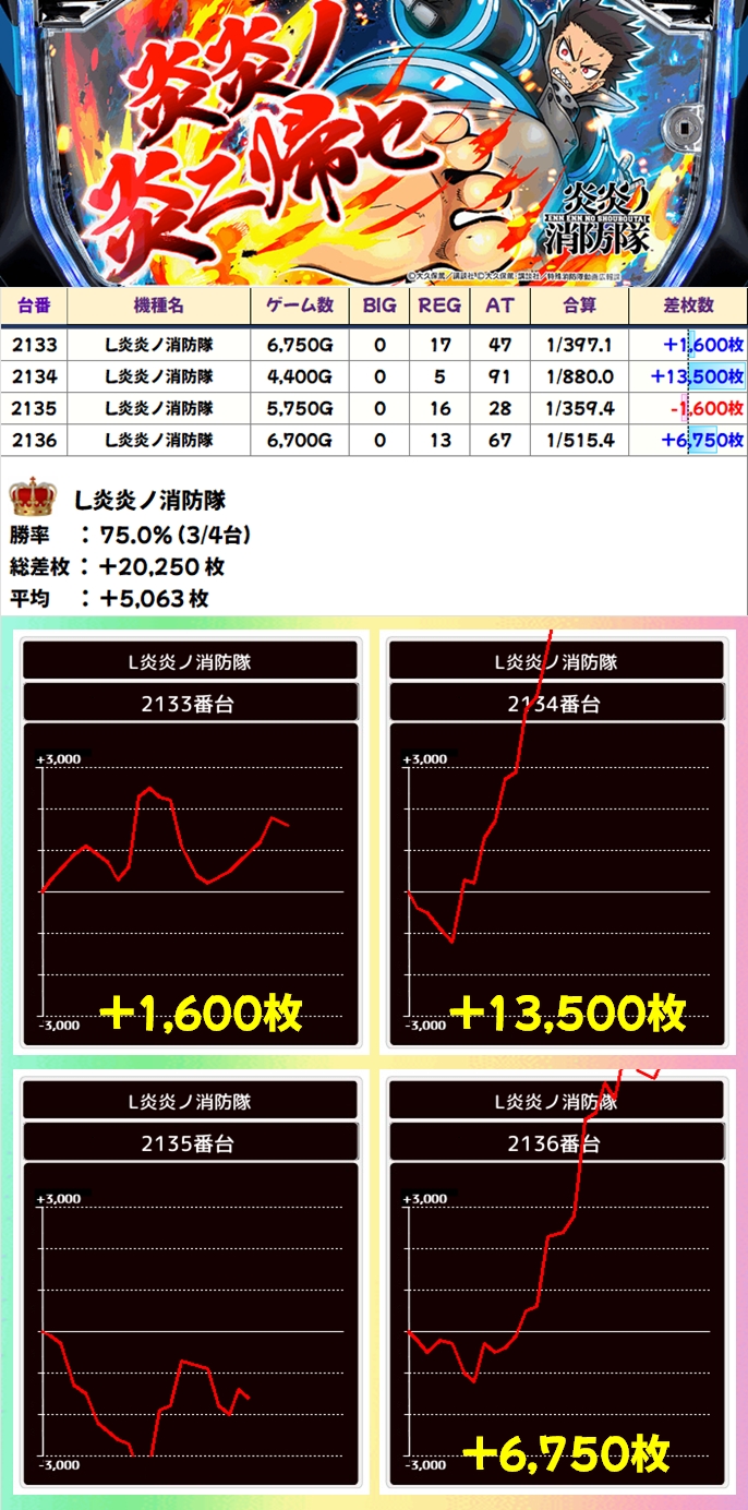 上記の機種からは+5000枚オーバーの大量出玉が続出し、L炎炎ノ消防隊からは+13500枚の万枚オーバー台も出現していました。