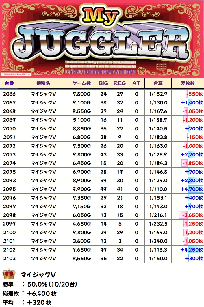 【1/2系濃厚】マイジャグV(10/20台+)→平均+320枚