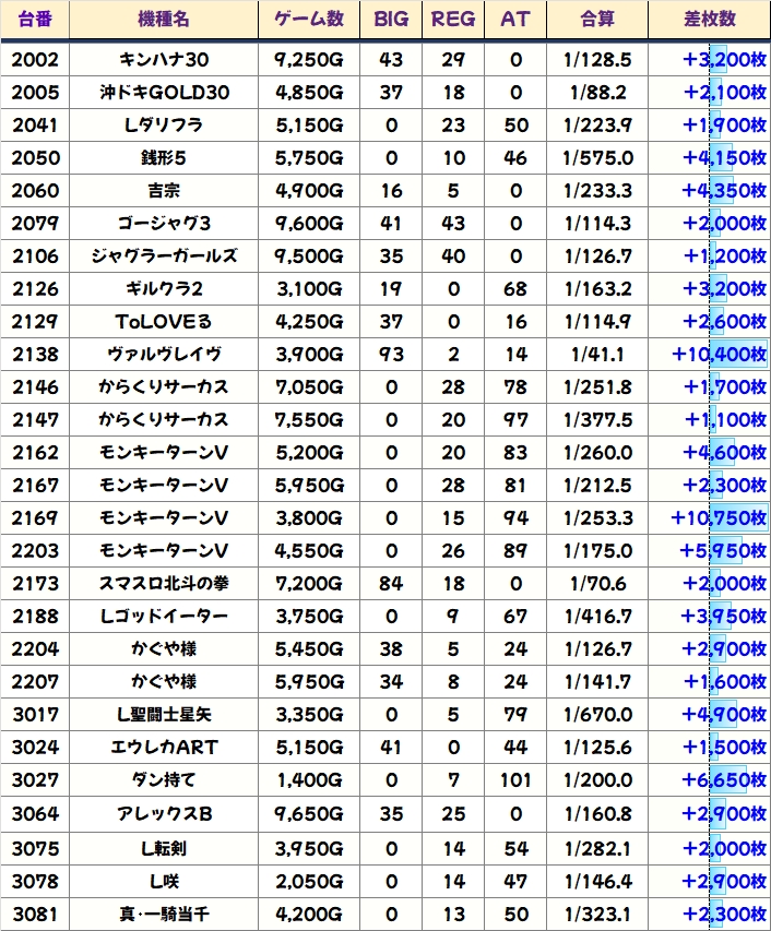 この日は単品投入にも力が入っていたようで、毎日オススメ機種のモンキーターンVを筆頭に優秀台を多数確認。