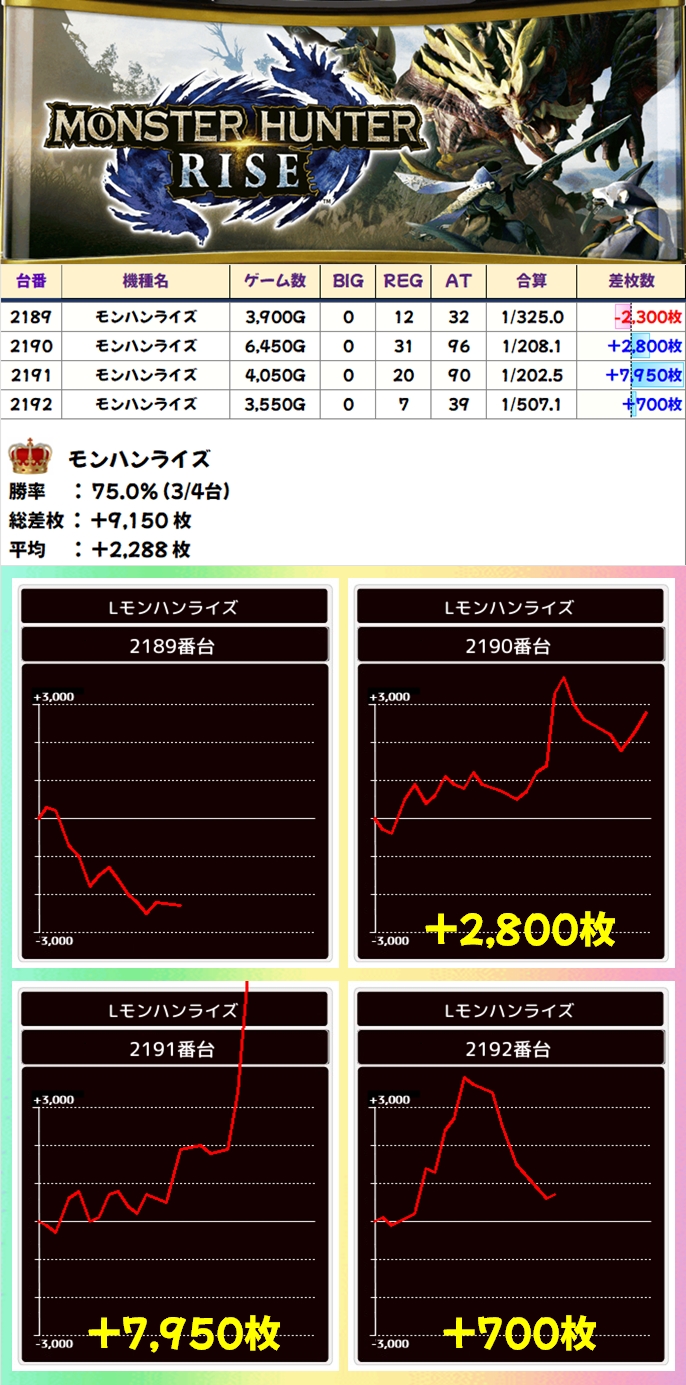 【全台系濃厚】モンハンライズ(3/4台+)→平均+2,288枚