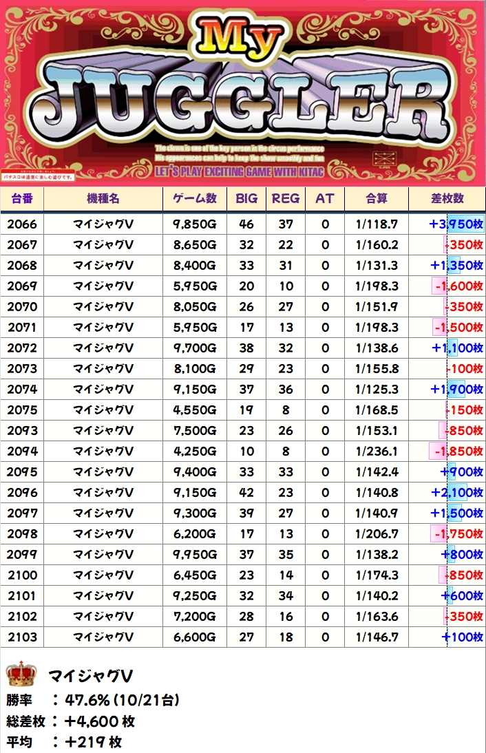 【1/2系濃厚】マイジャグV(10/21台+)→平均+219枚