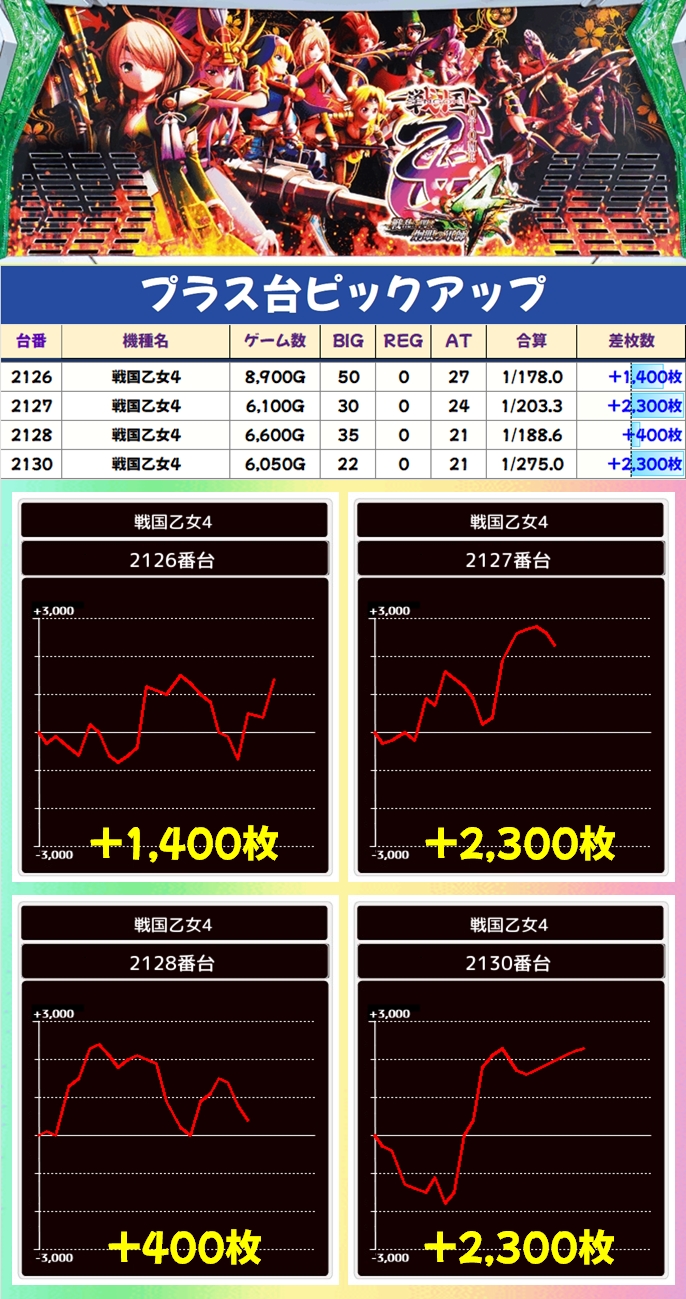 同店は少台数機種の全台系を用意する傾向にありますが、今回も3台前後の機種から全台系濃厚機種を多数確認!