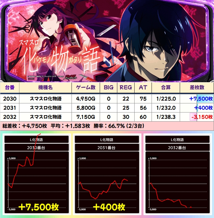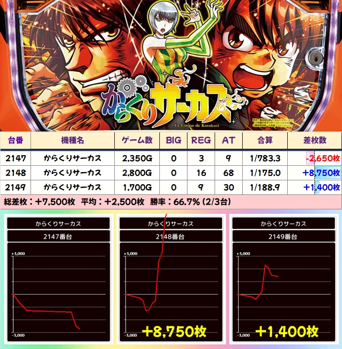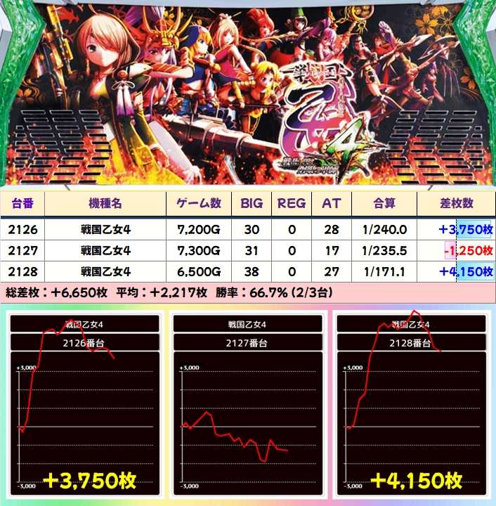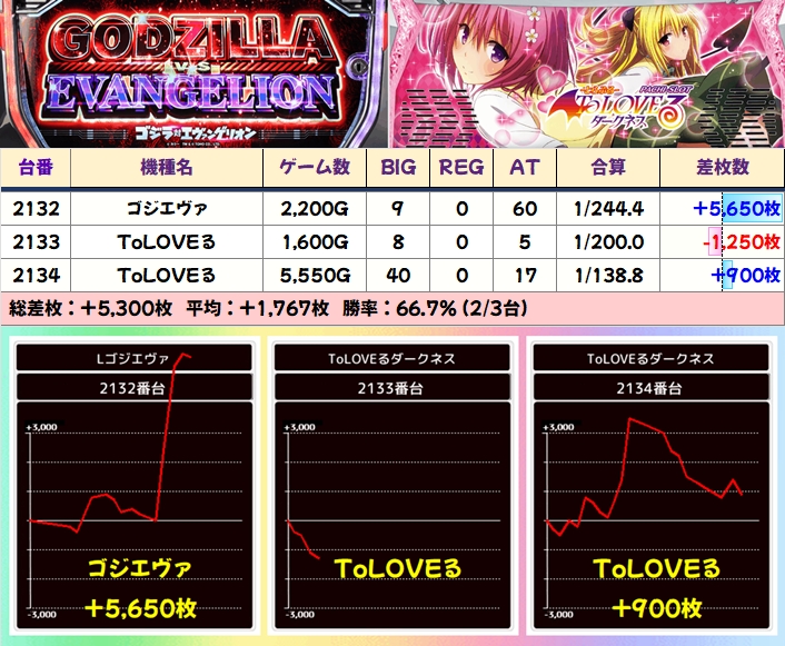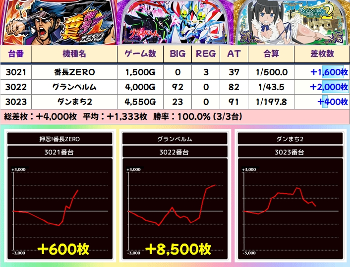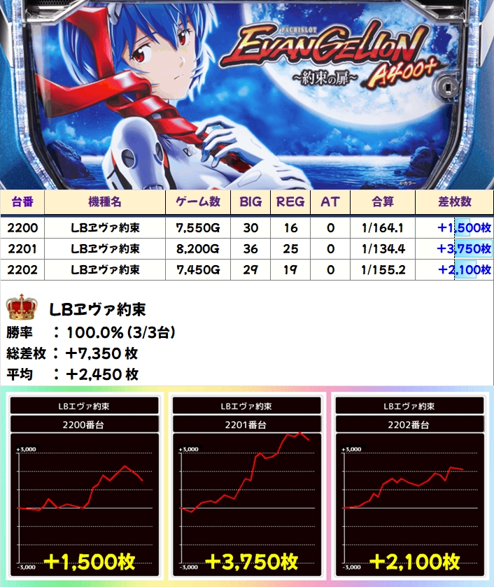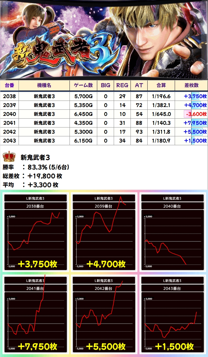 この日は示唆を確認できた新鬼武者3とエヴァ約束の両方が全台系濃厚の結果になっており、新鬼武者3は平均+3000枚超、エヴァ約束は+平均2000枚超と大幅プラスを記録!