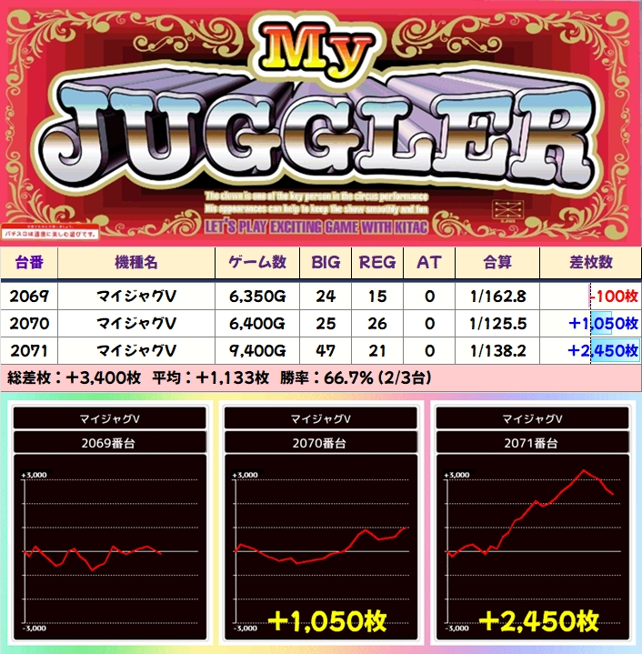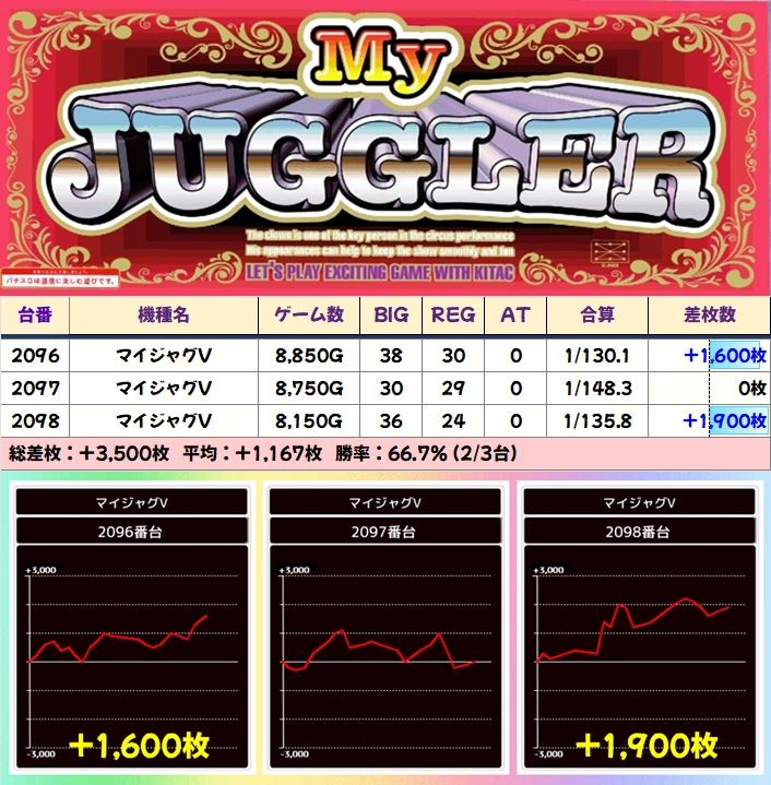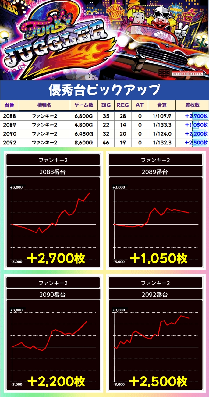 さらにジャグラーシリーズの中からファンキーも高配分になっており、+2000枚超の優秀台を複数確認することができました。