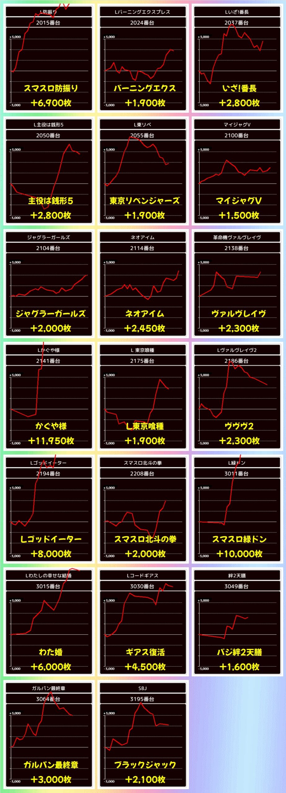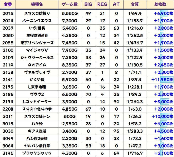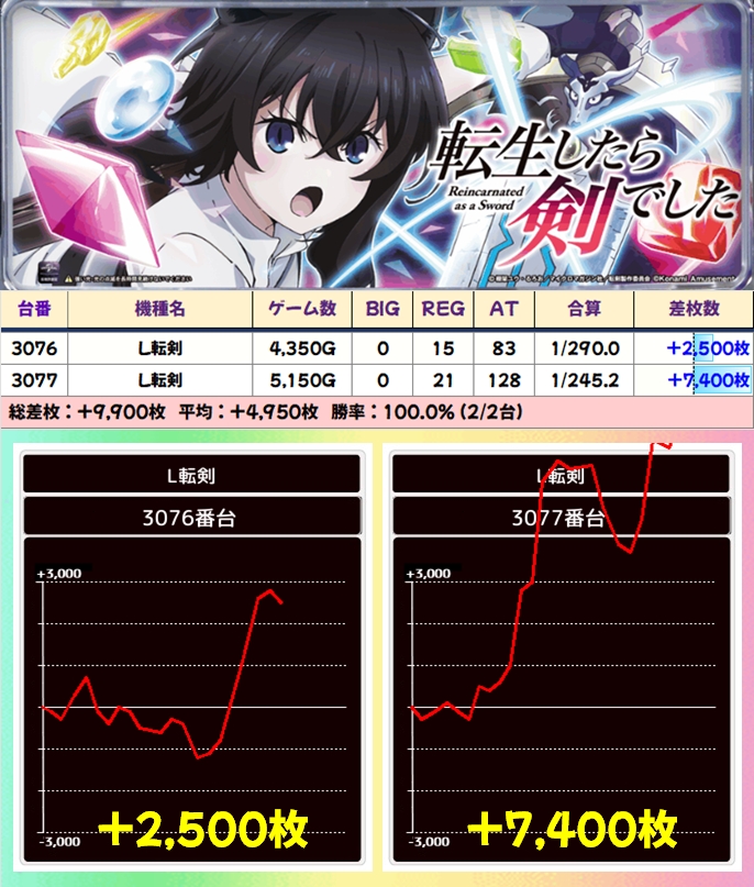 七つの魔剣からは+9800枚の万枚クラスの台も出現しており、悪番対策として少台数機種にもしっかりお宝台が用意されていたことが分かる結果に!