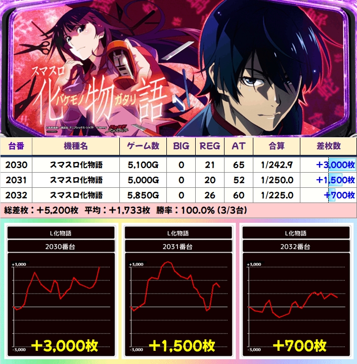 今回はお馴染みのジャグラーシリーズの並びを確認でき、その他にも最新台の化物語から3台並びを確認!