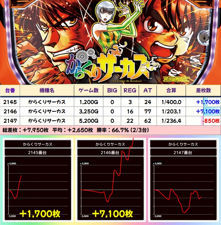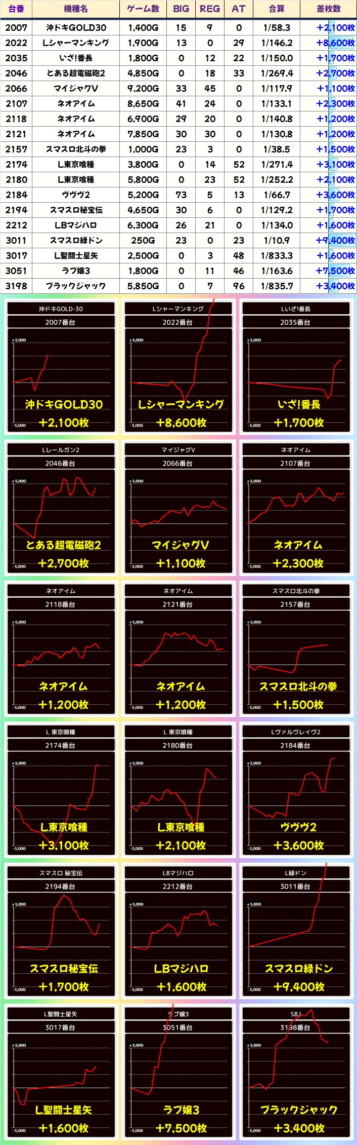 今回は仕掛け以外にも単品での投入を多数確認でき、フロアを問わず様々な機種から優秀台が出現!