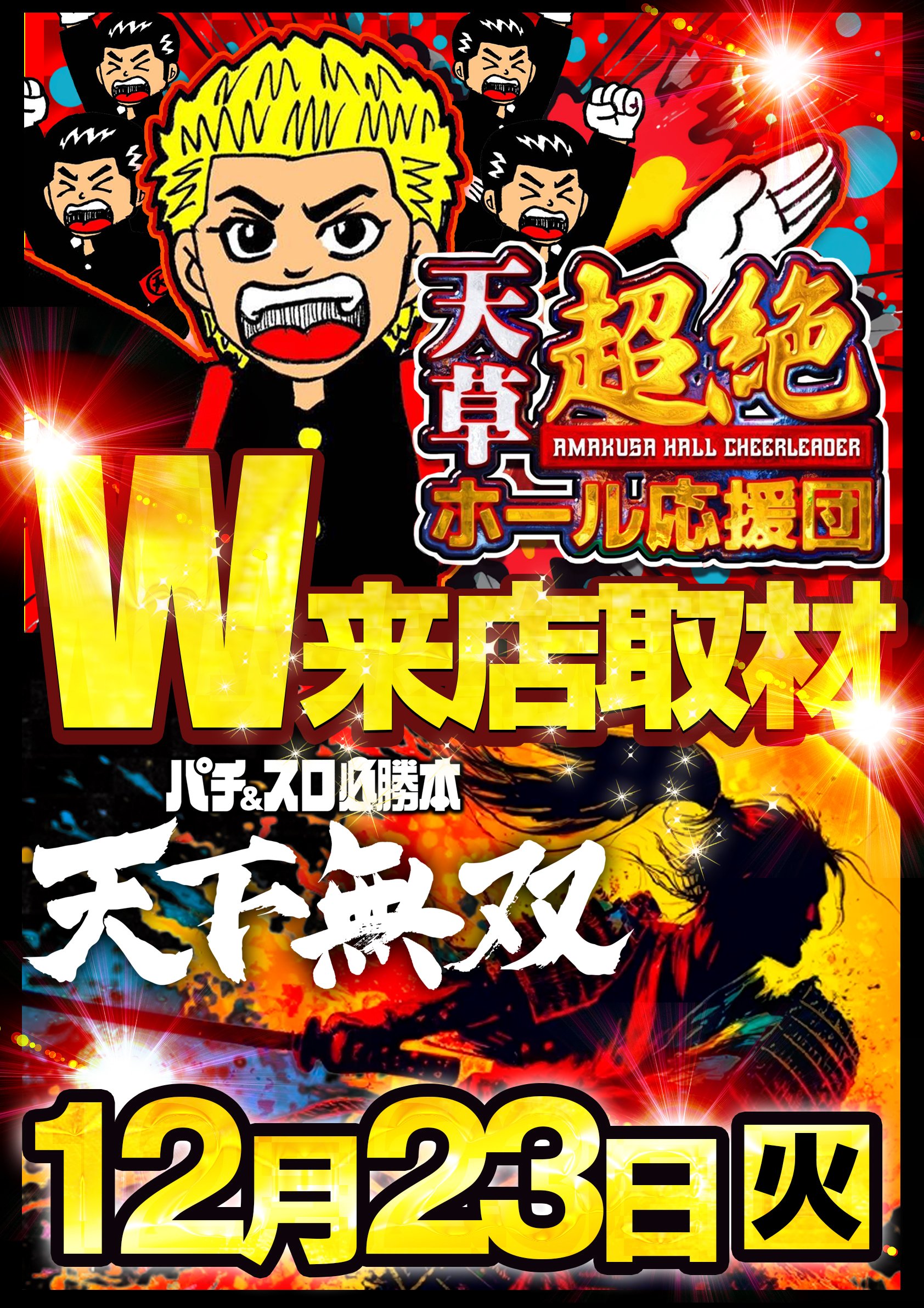 12月23日(火)|エスパス溝の口新館|2025年ラストの月イチ周年日!先バレと天草超絶応援団・天下無双のW開催で大量の仕掛けが登場!もちろん単品優秀台も多数アリ!