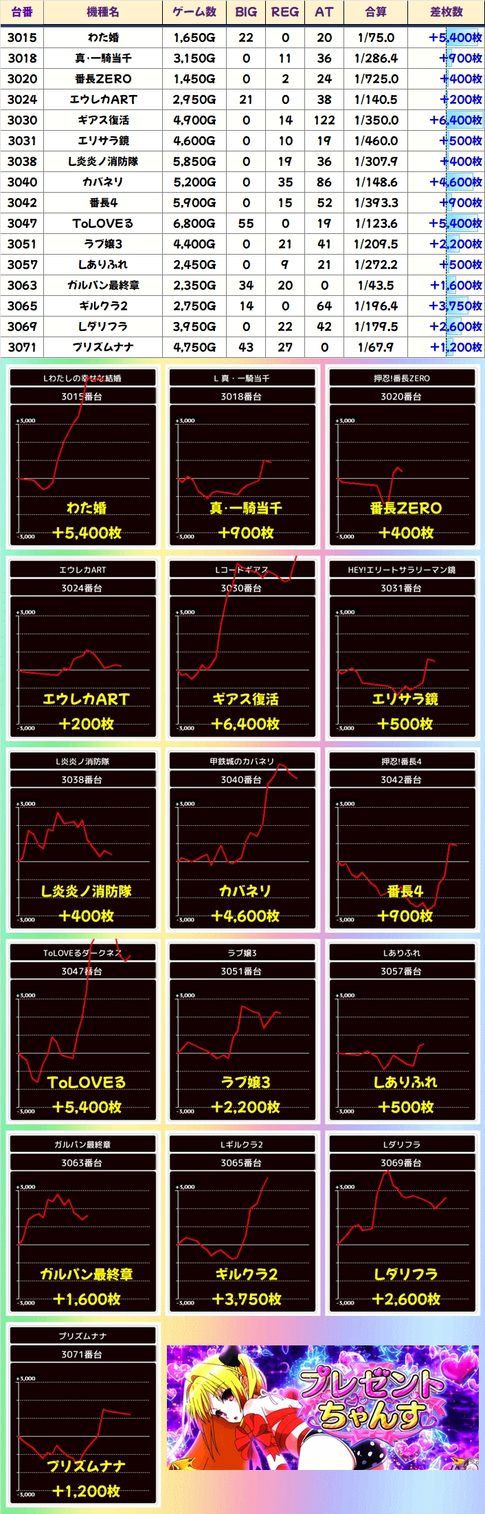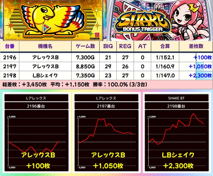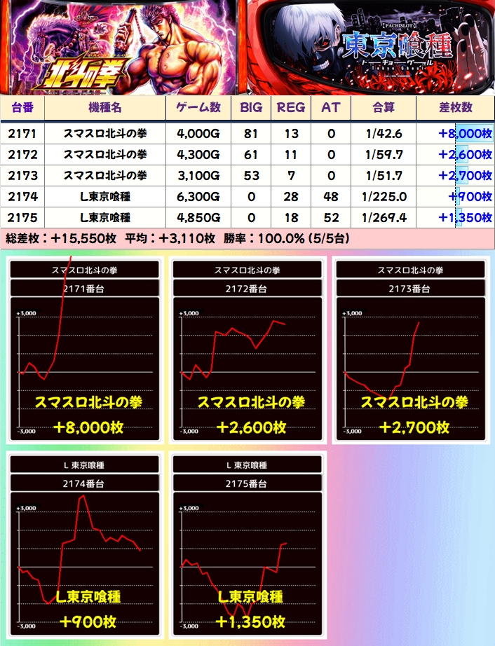 北斗は稼働不足の台があり少しもったいない結果になっていますが、平均+2368枚と全台系に相応しい結果になっていました。