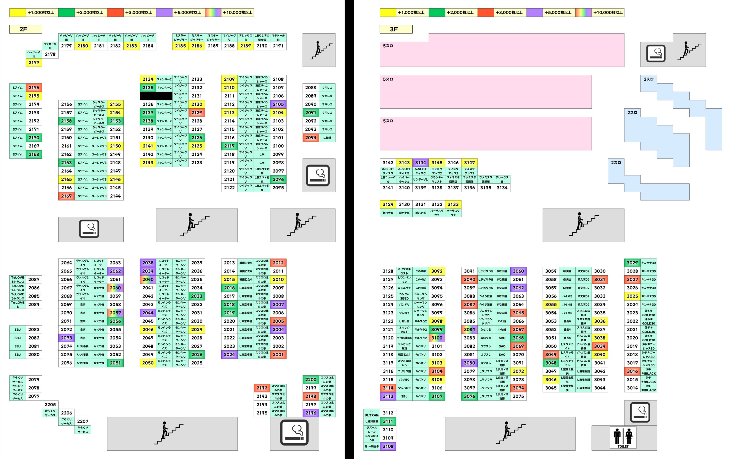 まとめた結果、2Fはメイン機種に仕掛けが大量に用意されており、3Fは全台系濃厚機種が複数ある…というお約束はいつも通りでした。ただ、その他にも高配分の箇所が多いため、結果的に今回もかなり強かったです!勝率も高いですよね!