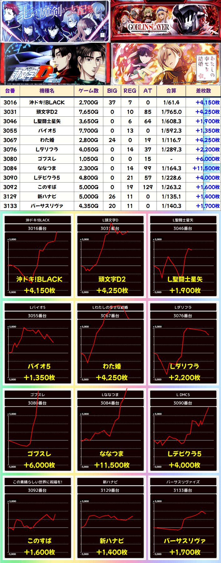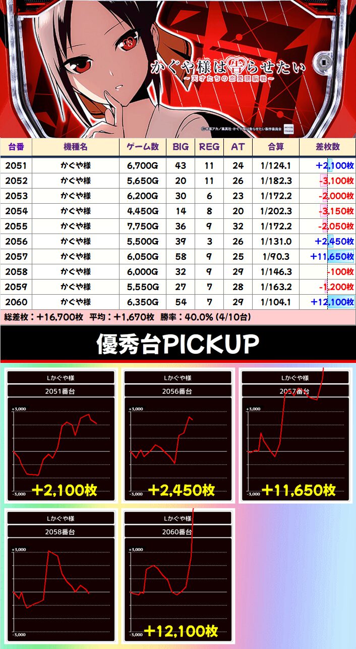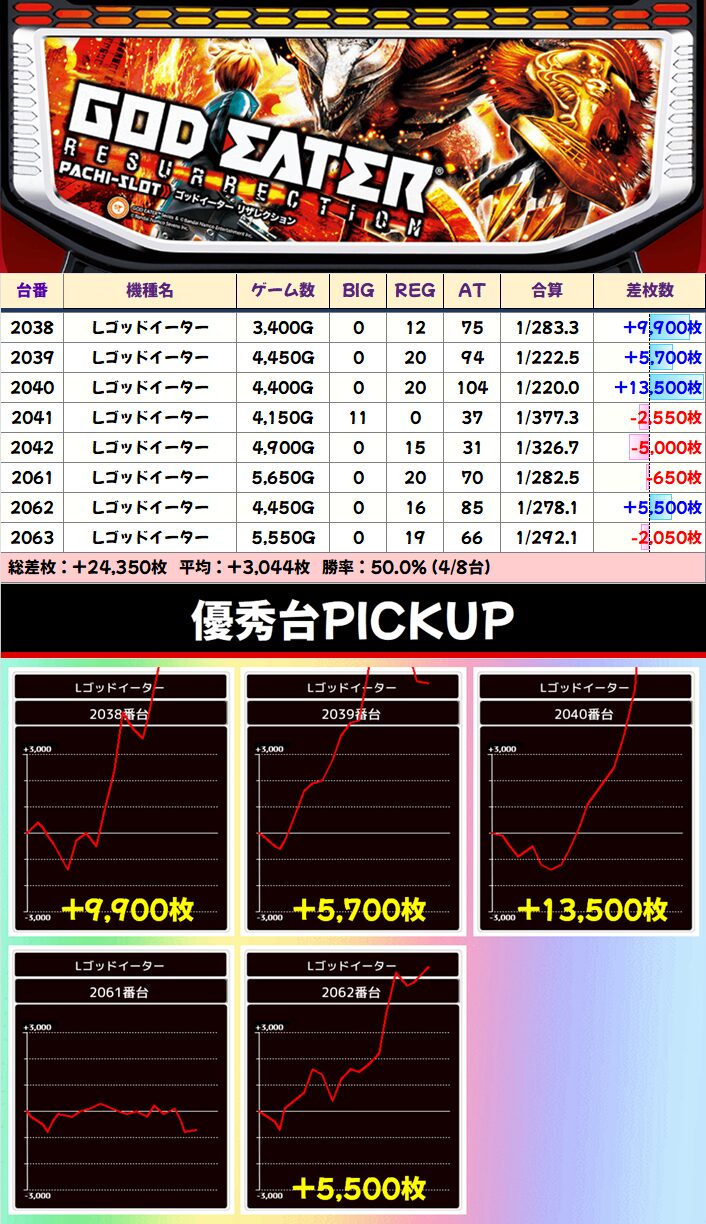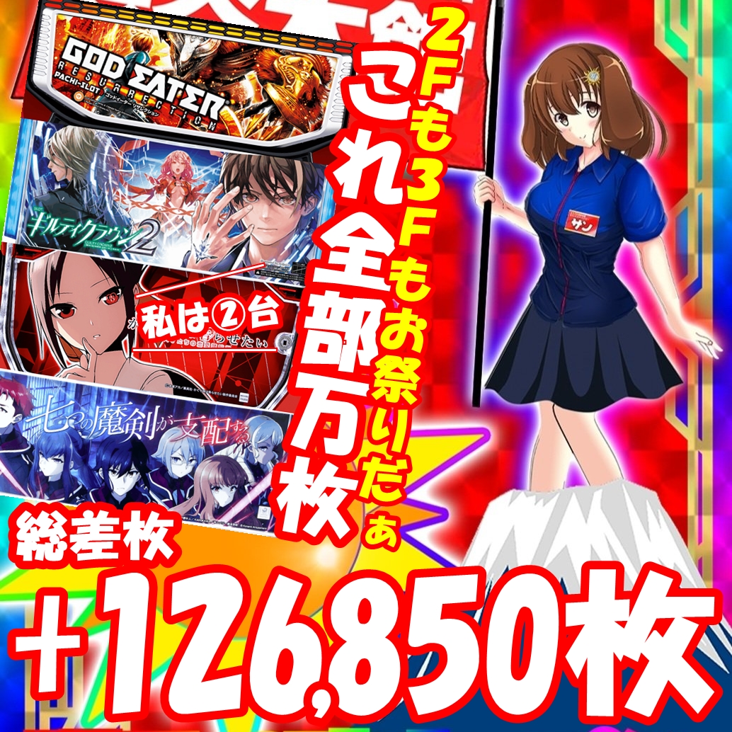 万枚超が5台、実質ゴッドイーターは2台あるようなもので、さらに増台に次ぐ増台で10台になったかぐや様が2台も万枚が飛び出す勢いに……もはやヴヴヴを超えてます。3Fからもななつま・ギルクラ2から万枚とド派手な結果になってますね。