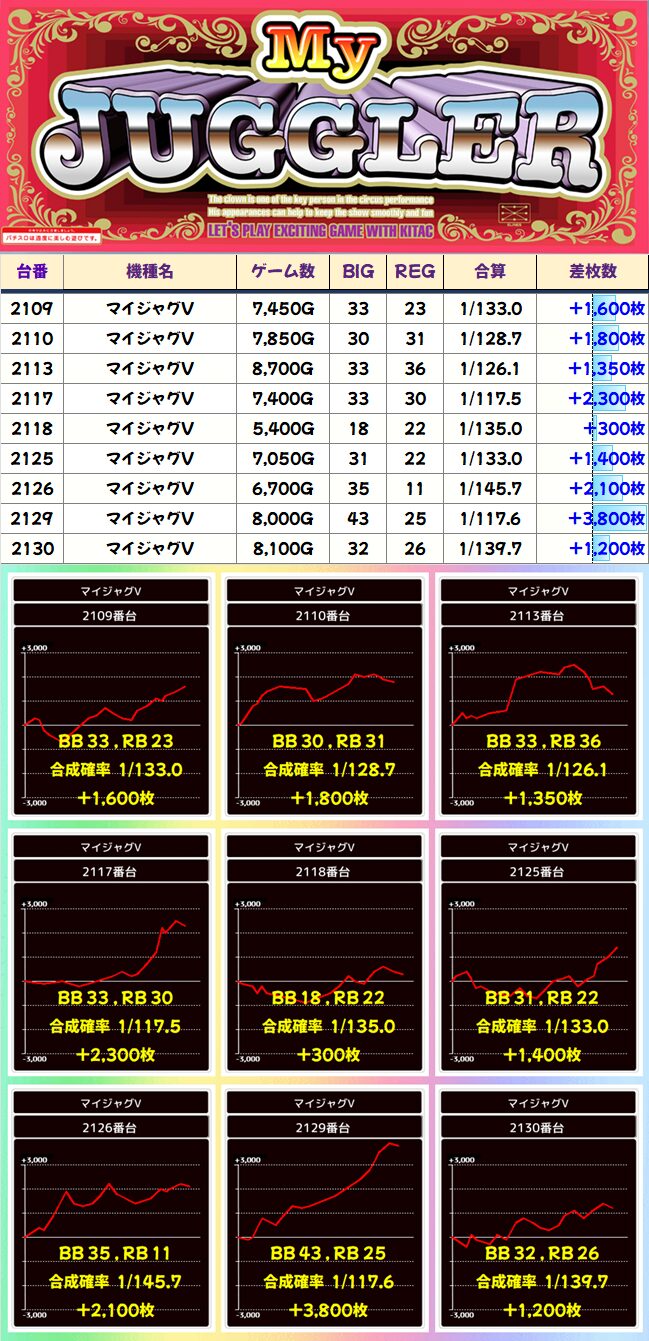 不発で終わっている台は早めに見切られているという感じか、粘ったもののBBの展開がキツい感じに。それでも高設定挙動のグラフが多いので全台系の可能性は十分あります。