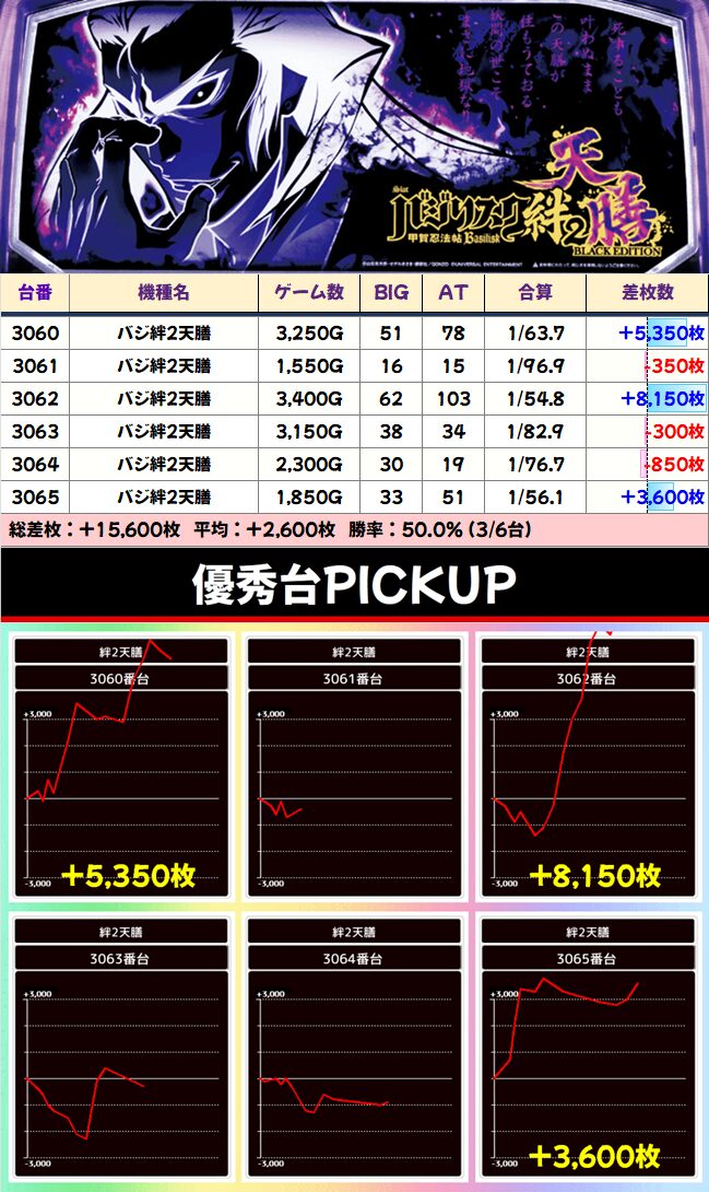 1/2系:バジ絆2天膳 平均+2600枚