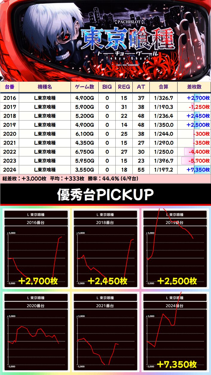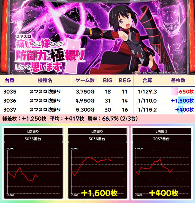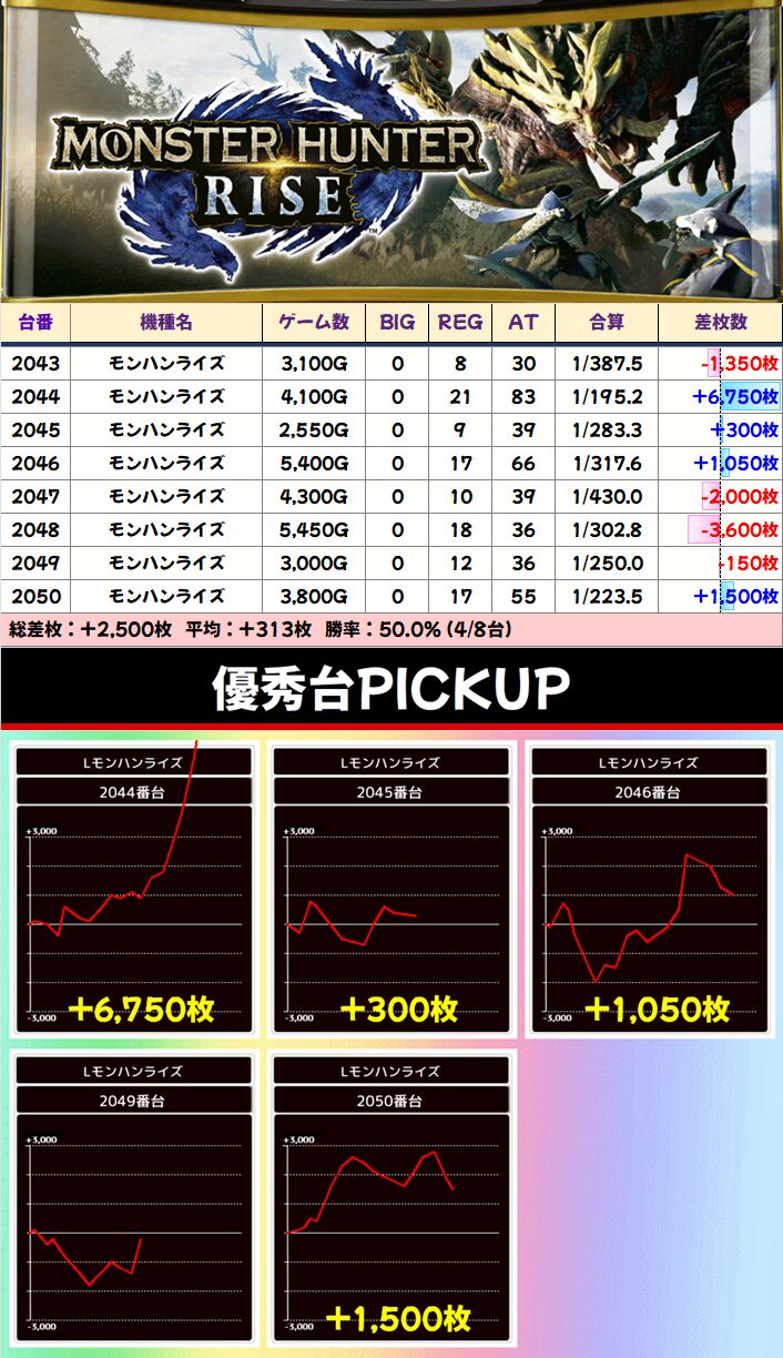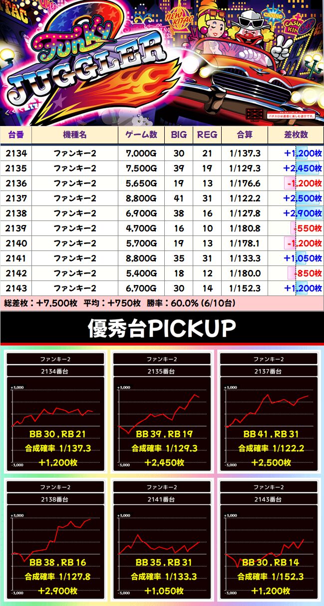 マイナスの台は大きなマイナスがないのに、プラス差枚はかなり派手な結果に。1/2系でもここまで展開がスゴイのも珍しい。