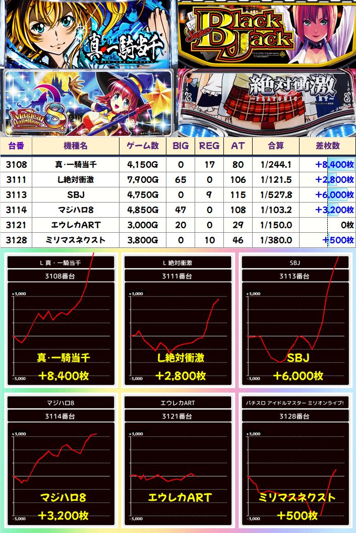 大きなプラス差枚の台が4台あります。そのなかでもリアルボーナスの絶対衝激とマジハロ8はやはり安定傾向のグラフになってますね。