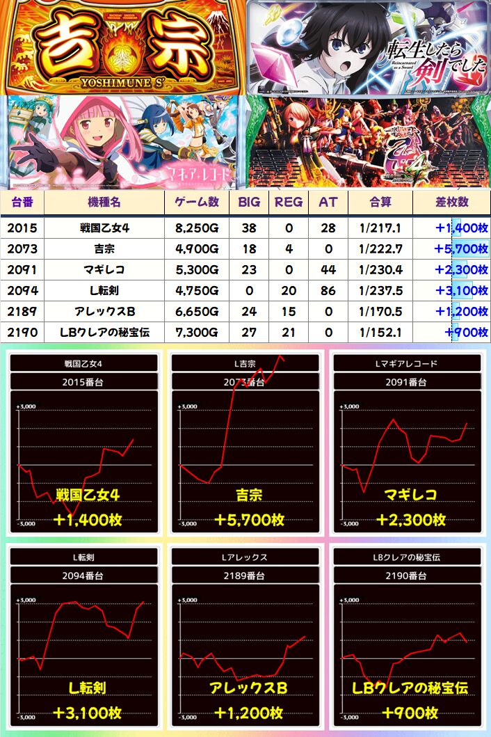 吉宗の出玉が目立ってますが、転剣の最初の一撃もかなりのモノがあります。ほかではBT機も比較的遊べる傾向か。