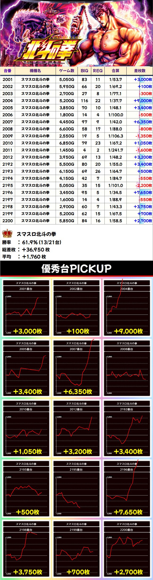 運命を殴りかえて上位に入った2105番台の出方がすごい。-3000枚から一気に9000枚を叩き出す強烈なのびかたを見せました。