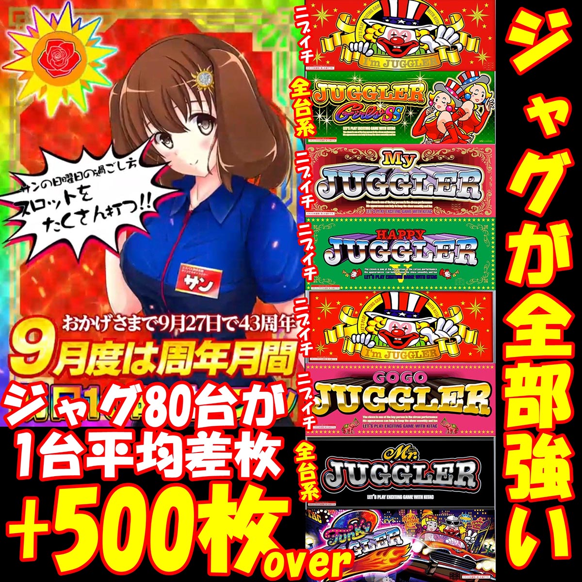 エスパス渋谷本館は9/27で43周年。9月は周年月間となっています。その勢いは第一日曜日、第二日曜日のどちらもしっかり総差枚が+10万枚overが証明してます。第三日曜…本命周年日まで残り1週間をきったこの日は、どんな仕掛けが待っているのか?ギルドの事前ポストは下記の通りです。