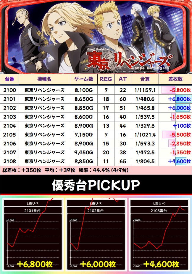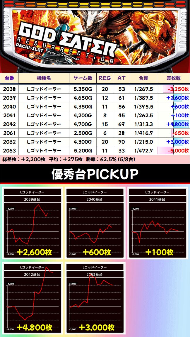 ほとんどが8000G以上の稼働で、その中でも上記3台が上位ATによる加速で一気に抜き出しました。2102番台は中盤までが出玉のピークでもその後も減らさずにキープ。