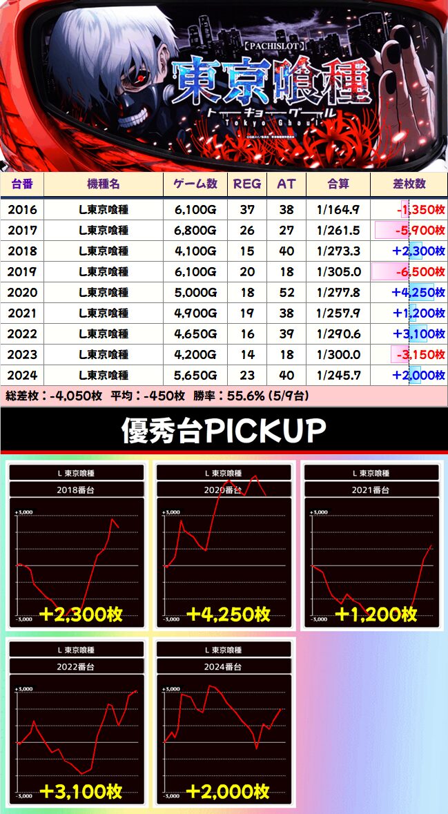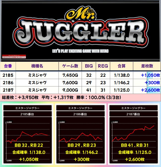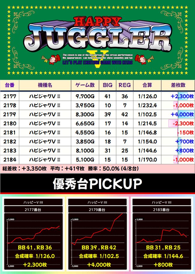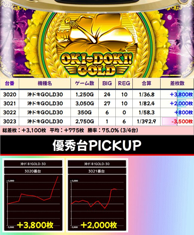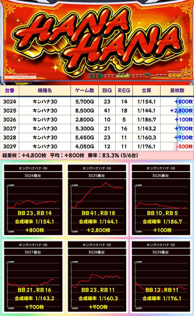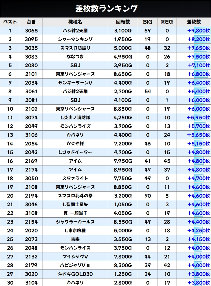合算確率が優秀な台が複数あり、おそらく1/2系の仕掛けではないでしょうか。3025番台はBIGが序盤から中盤にかけて集中したことで頭一つ抜け出しました。